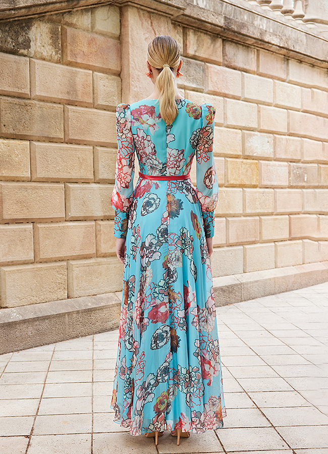 Cette robe longue Carla Ruiz illumine les cérémonies avec son imprimé floral éclatant sur fond turquoise. Sa coupe fluide, ses manches longues légèrement bouffantes et son décolleté en V offrent une silhouette élégante et gracieuse, idéale pour les invitées de mariage en quête de raffinement et de légèreté.