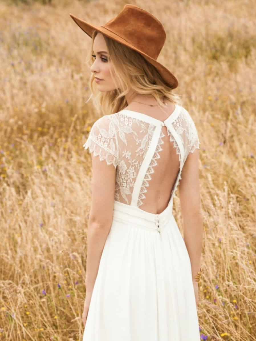 Aimée est une robe de mariée de la marque Rembo Styling. Top en crêpe décolleté V bordé d’une jolie dentelle fine. Dos de dentelle en forme de goutte avec une finition crêpe et festonné de dentelle.Ceinture large à plis plats taille haute.Jupe en crêpe légèrement froncée à la taille.Robe fabriquée au Portugal dans les ateliers Rembo Styling.