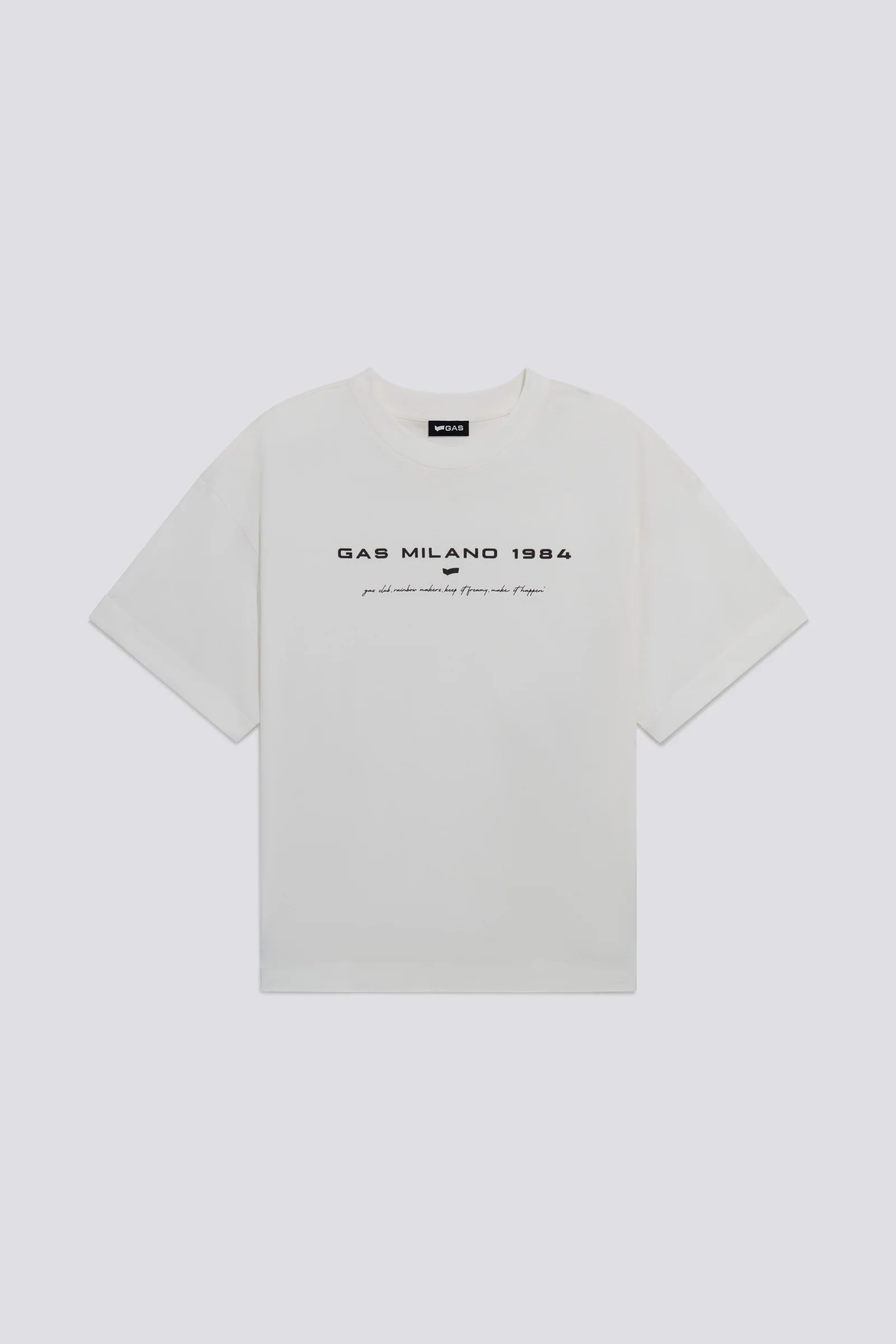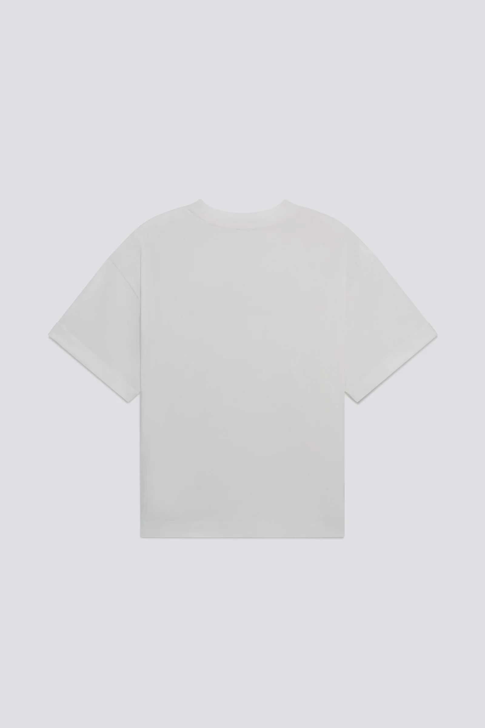 T-shirt donna a manica corta con fit comfort e orlo risvoltato fisso. Realizzata in jersey di puro cotone, si distingue per la stampa ad acqua e dettagli flock sul fronte, esaltati da una tintura a pigmento che le dona un aspetto unico e vissuto. Easy, bold, effortlessly cool.