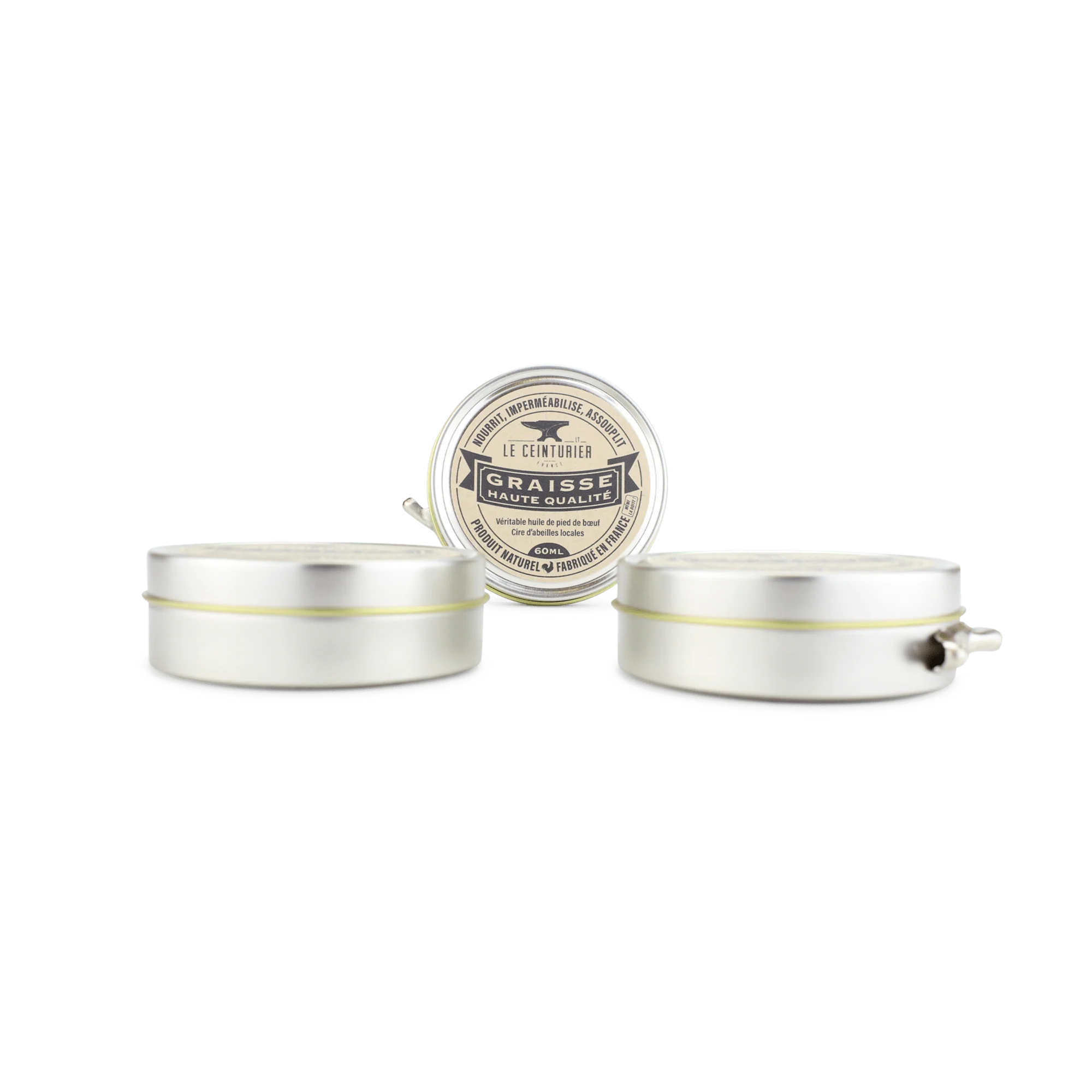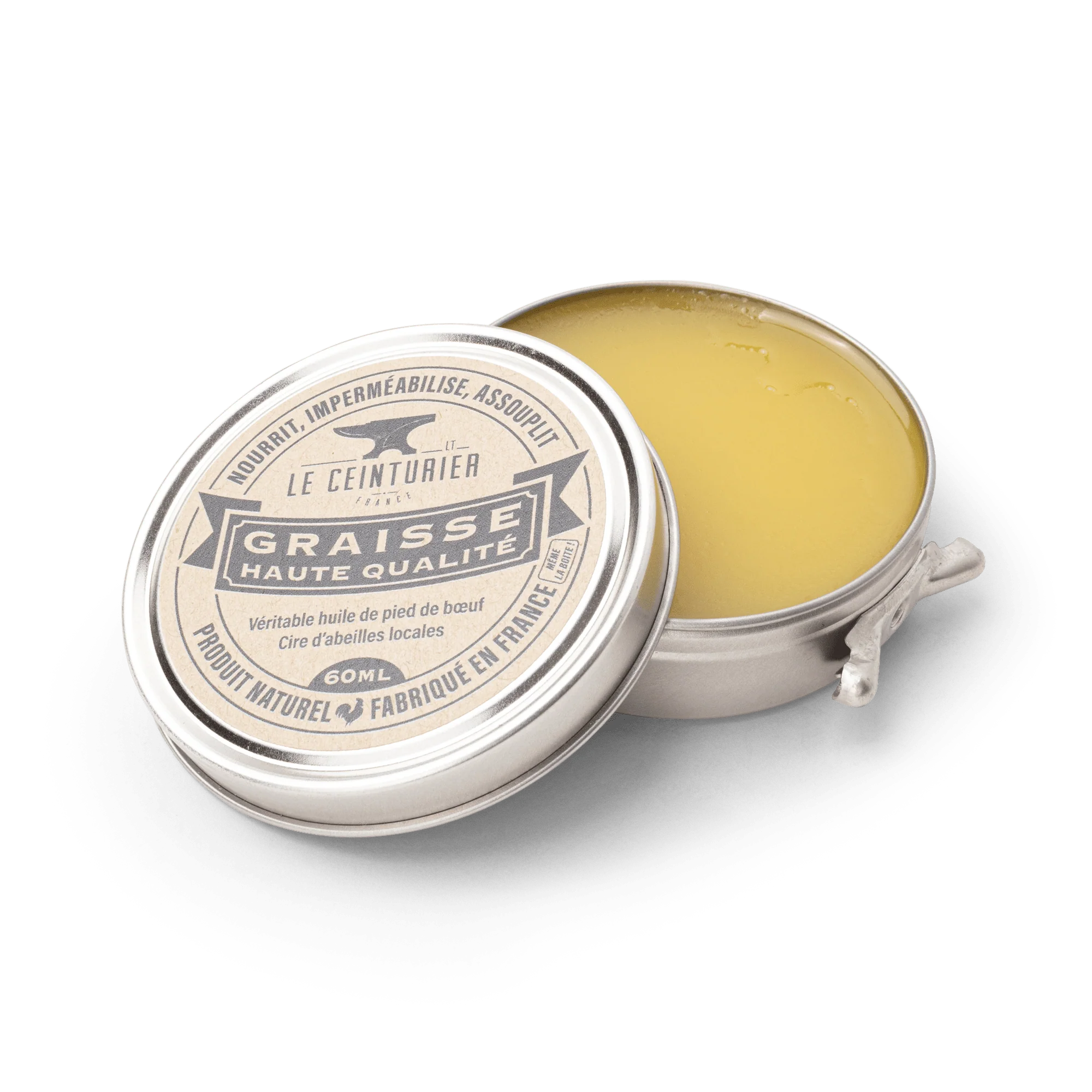 • Composition : huile de pied de bœuf, huiles minérale et végétales, suif de bœuf, cire d’abeille, de carnauba, et des cires minérales