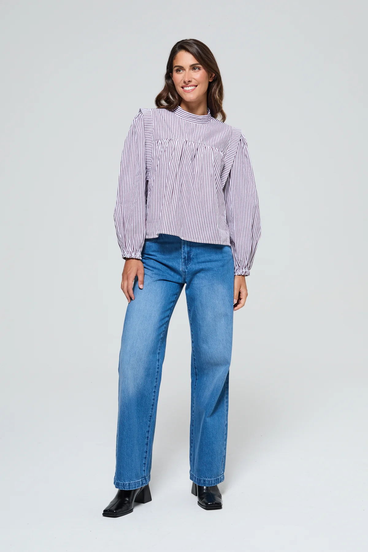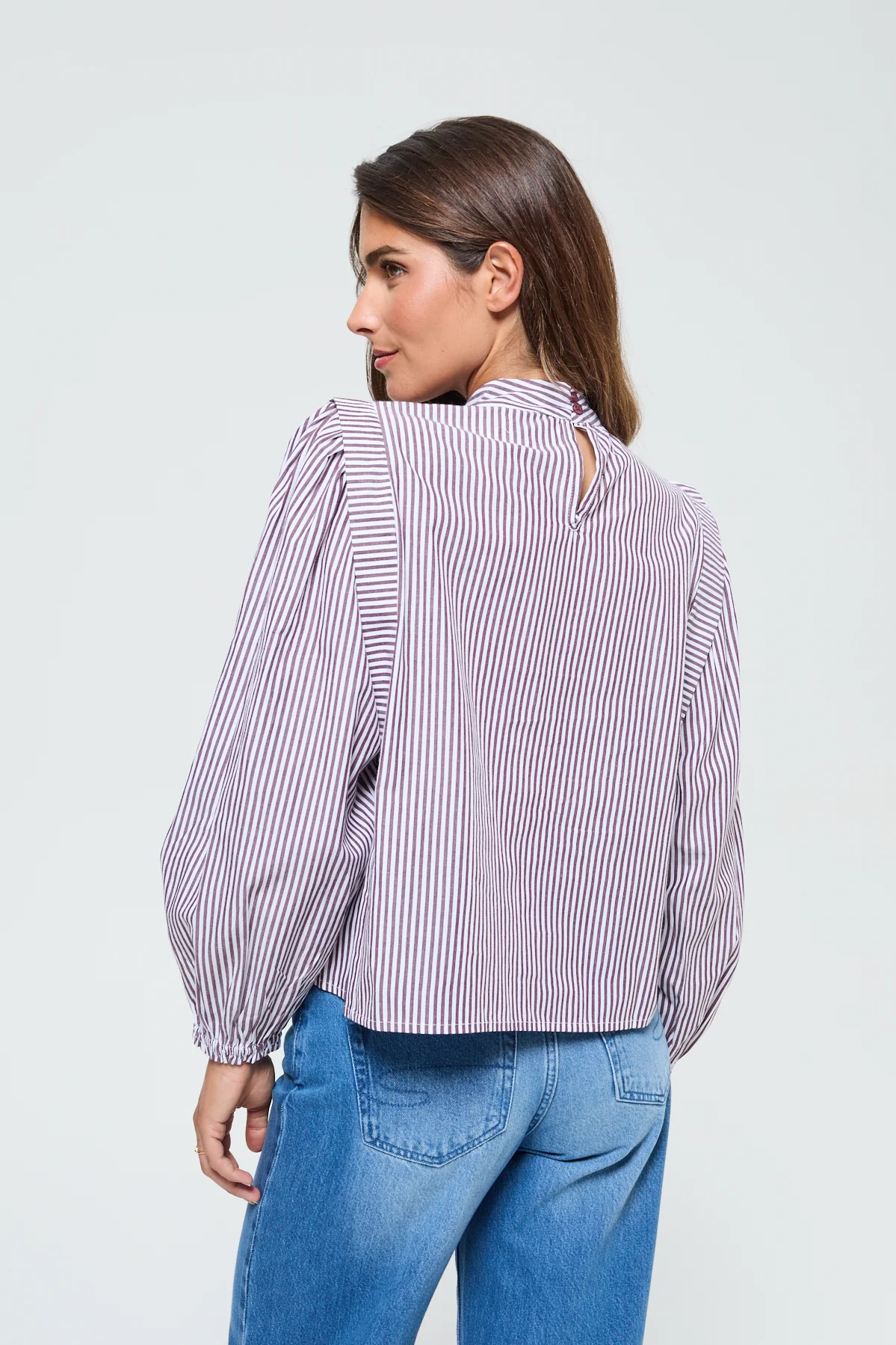 Dotée de manches longues légèrement bouffantes et resserrées aux poignets, elle ajoute du volume tout en douceur. Son encolure montante froncée avec petit bouton au dos apporte une touche sophistiquée, tandis que les fronces sous l’empiècement poitrine créent un joli tombé fluide et féminin.