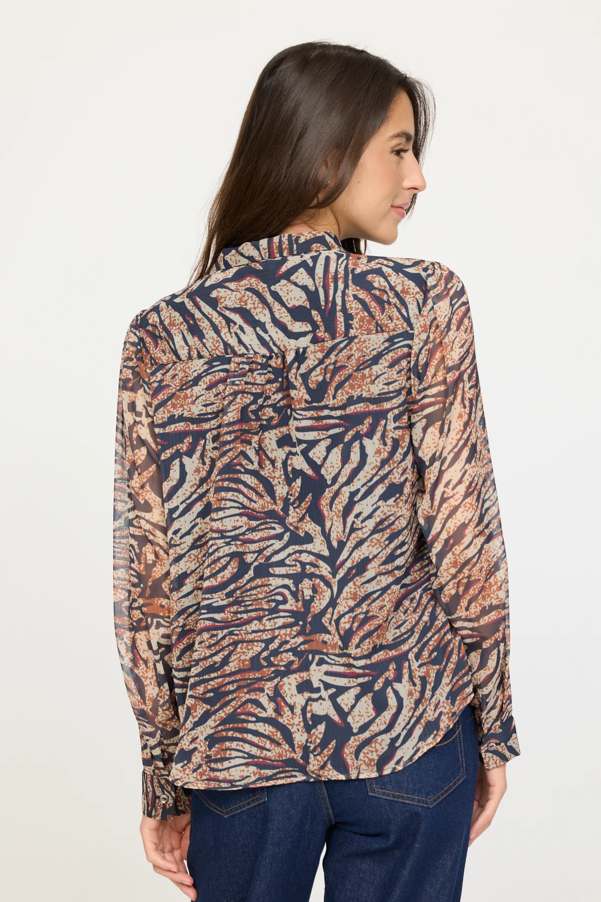 Blouse femme en mousseline doublée au motif léopard confectionnée en 100% polyester, elle offre une matière fluide, aérienne et confortable grâce à sa doublure intégrée.