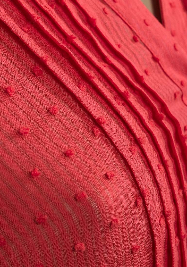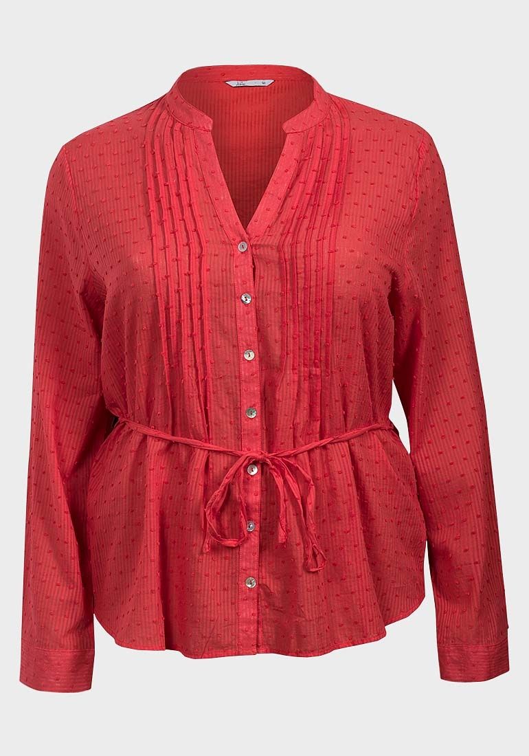 Blouse plumetis rouge Nous vous conseillons de prendre une taille au dessus de votre taille habituelle Fabriquée à partir d’un coton rayé semi-transparent Encolure Y Fermeture boutonnée Détail nervuré sur la poitrine Poignets boutonnés Taille à nouer Article dégriffé