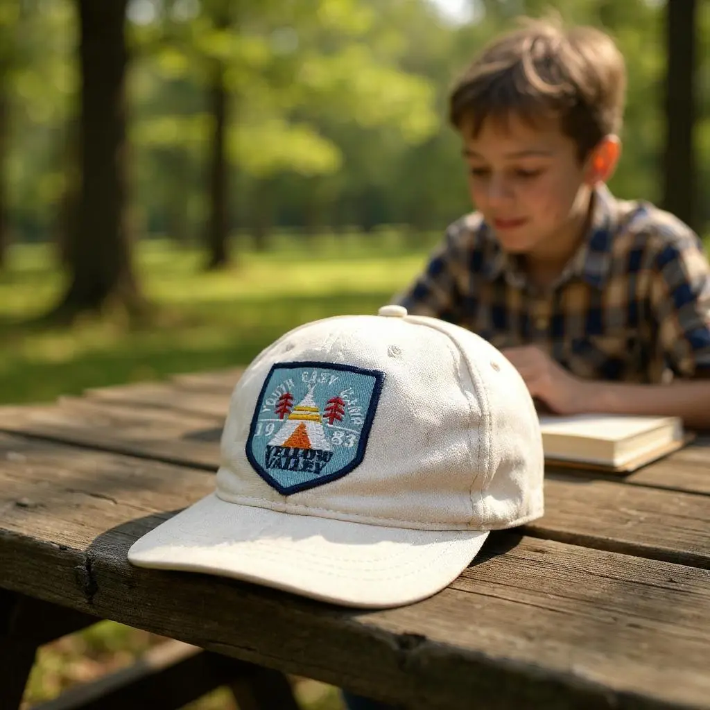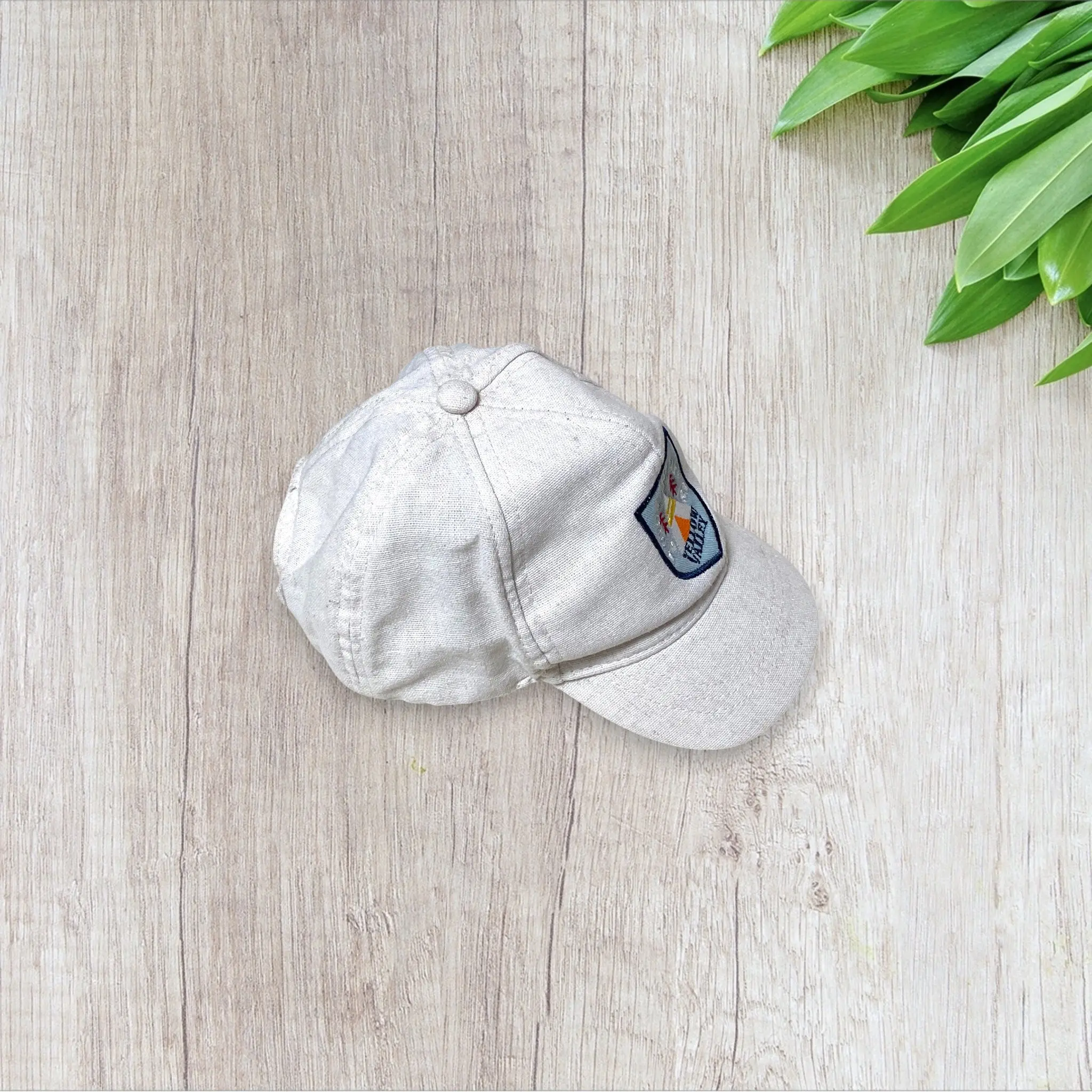 🧢 Casquette garçon beige de la marque Tape à l’œil, en très bon état. Broderie stylisée “Yellow Valley” sur le devant, représentant un paysage nature avec sapins et montagne, style scout / camping vintage.