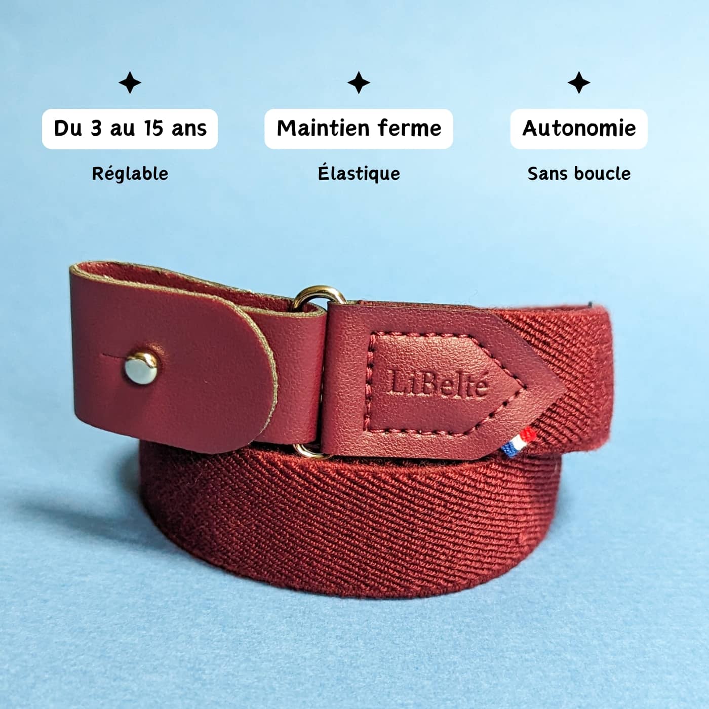 La ceinture sans boucle Libelté® modèle bordeaux, c’est une SEULE ceinture pour toute sa croissance. Fabriquée en France, elles assurent un maintien parfait tout au long de la journée. Pas de boucle à manipuler, un vrai gain de confort et d’autonomie pour votre enfant. Une petite révolution récompensée par le magazine PARENTS.