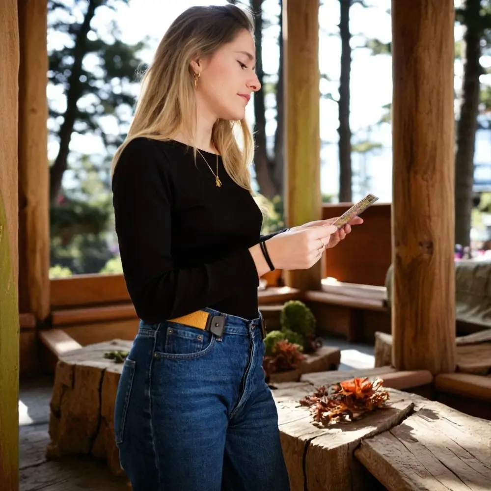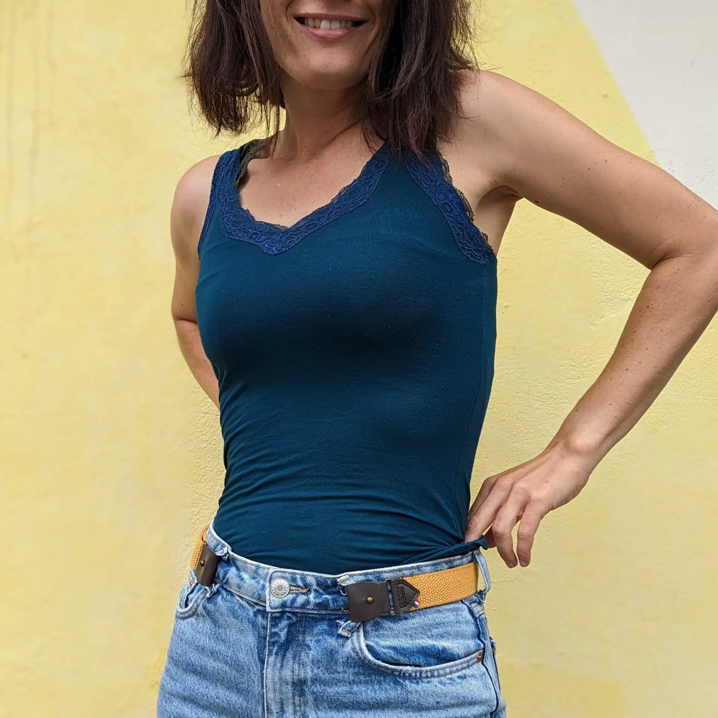 Libérez votre respiration avec notre ceinture sans boucle Libelté couleur Moutarde. Elle apportera une touche lumineuse à vos tenues.
