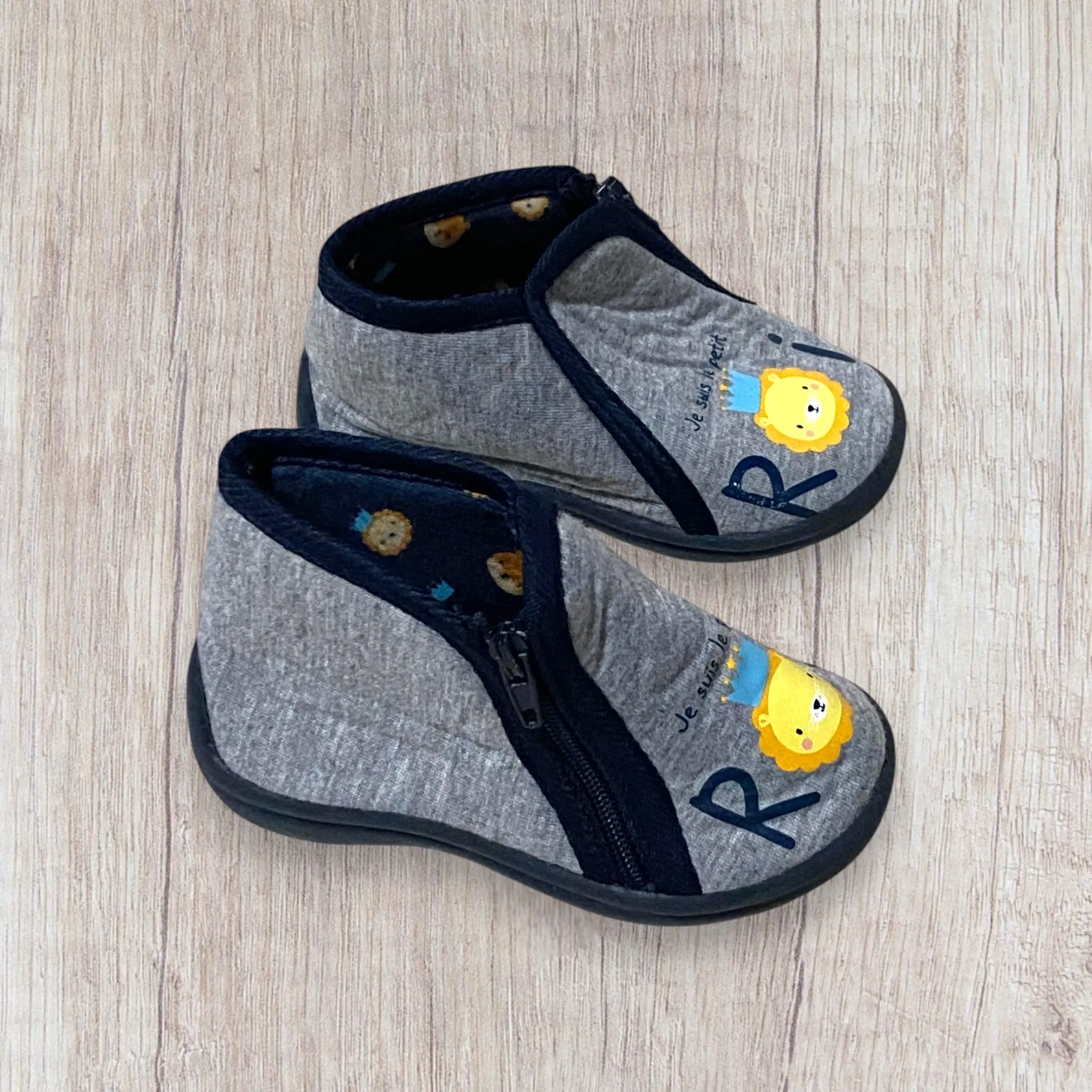 Ils affichent un mélange de rose, noir et bleu clair pour la version fille, avec un mignon pingouin portant une écharpe etgris clair et bleu marine s’associe à un motif adorable : l’inscription “C’est moi le roi”, où le “O” est remplacé par un petit lion portant une couronne pour la version garçon.