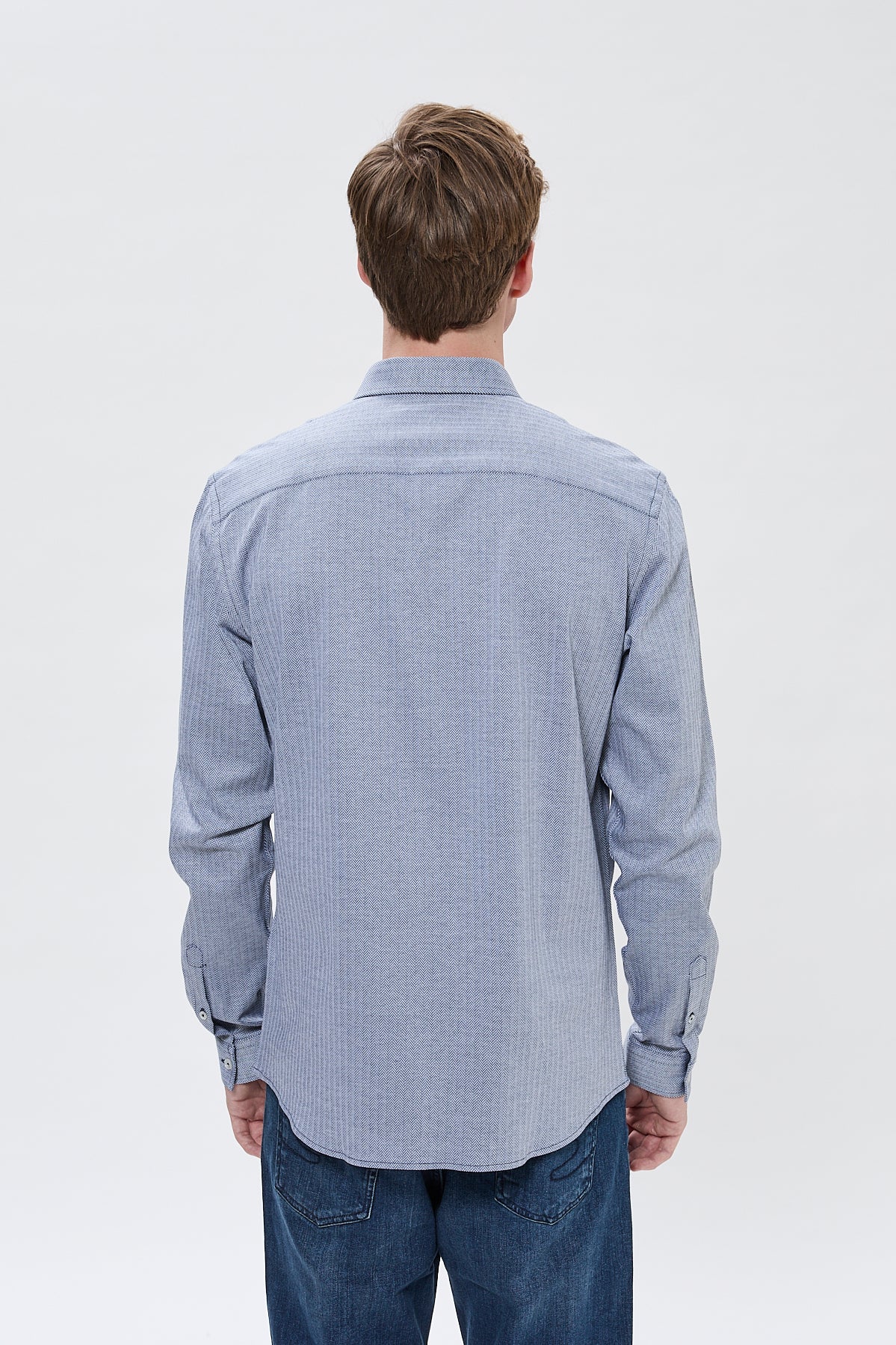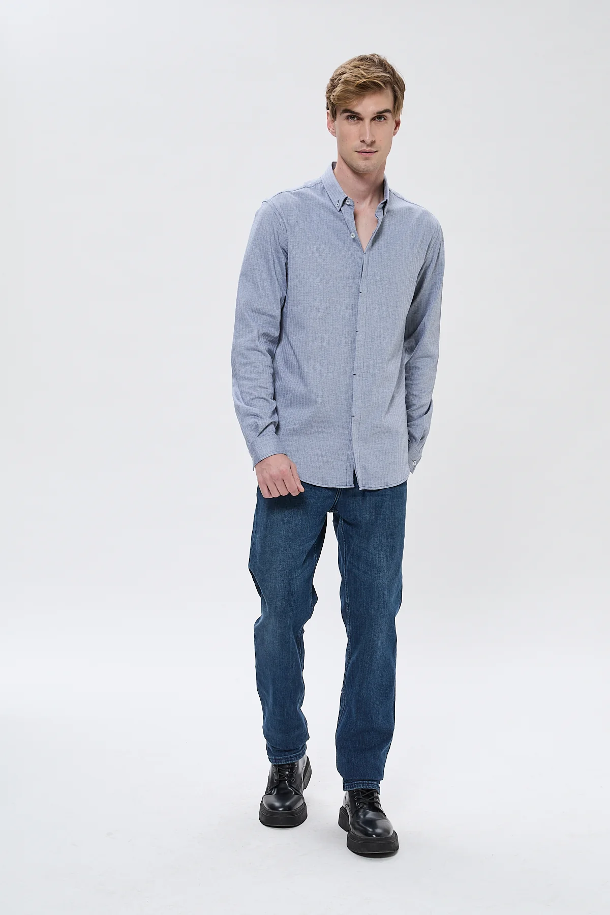 Avec sa coupe regular, ses manches longues et son ouverture boutonnée, cette chemise se distingue par sa patte de boutonnage cachée, créant une silhouette plus épurée et soignée. Ce détail soigné renforce l’aspect sophistiqué de cette pièce.