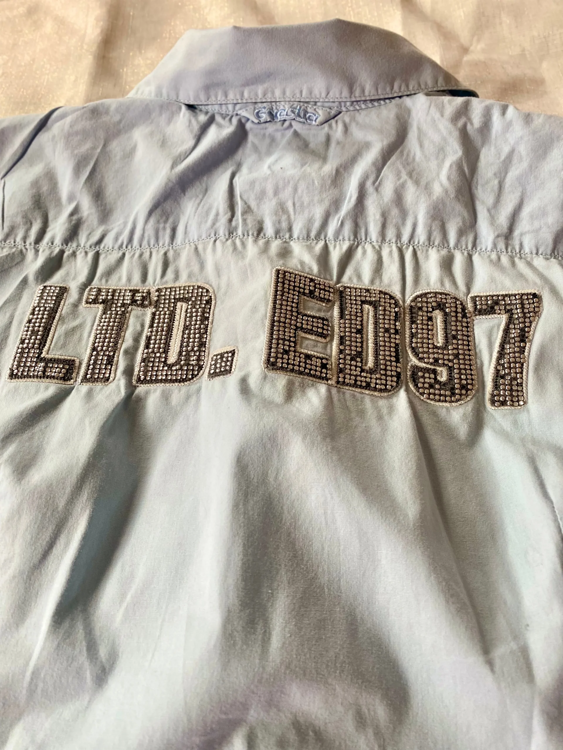 - Écriture en strass argenté dans le dos avec broderie grise et blanche : Touche d’éclat et de sophistication.