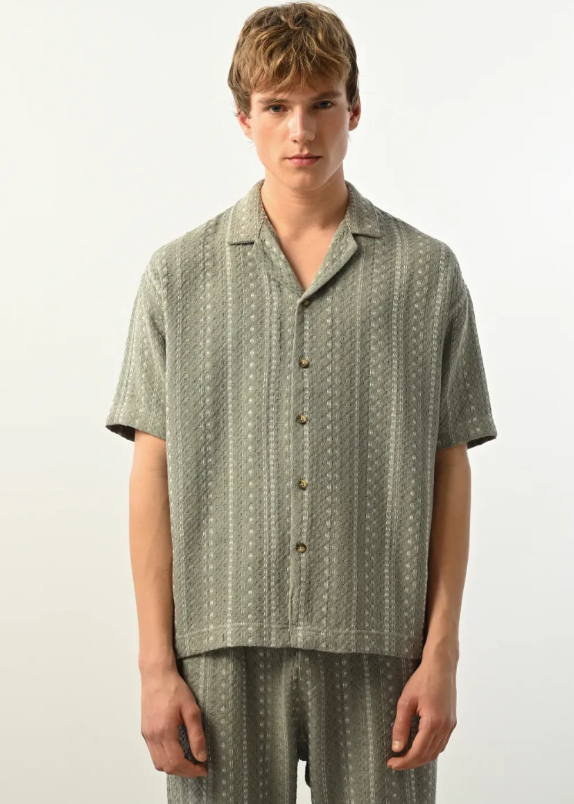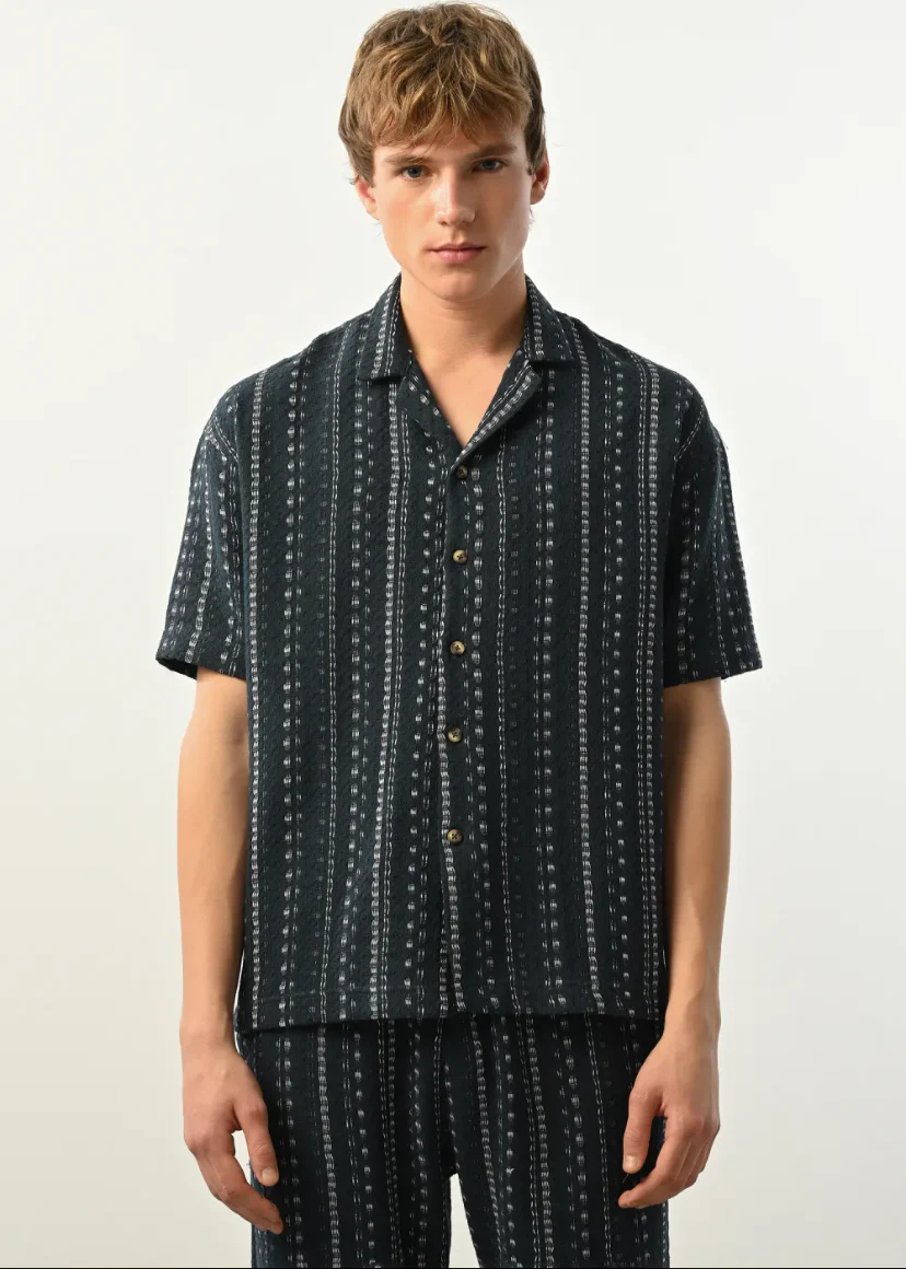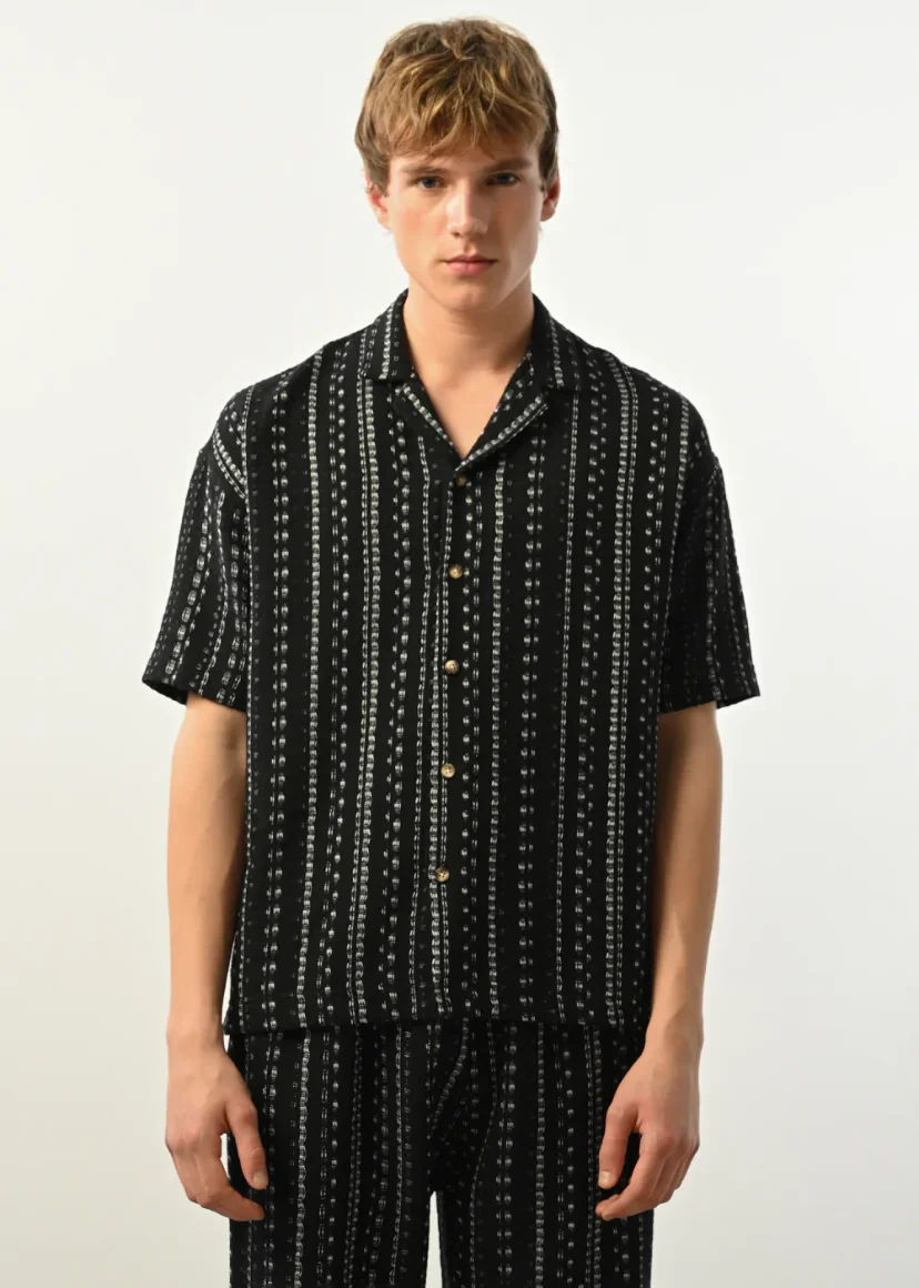 Avec son motif vertical graphique et sa matière fluide, cette chemise noire offre un style à la fois audacieux et décontracté. Sa coupe droite, ses boutons contrastés et son col cubain inspiré des classiques estivaux en font une pièce forte du vestiaire masculin. À porter seule ou en total look avec le pantalon assorti.