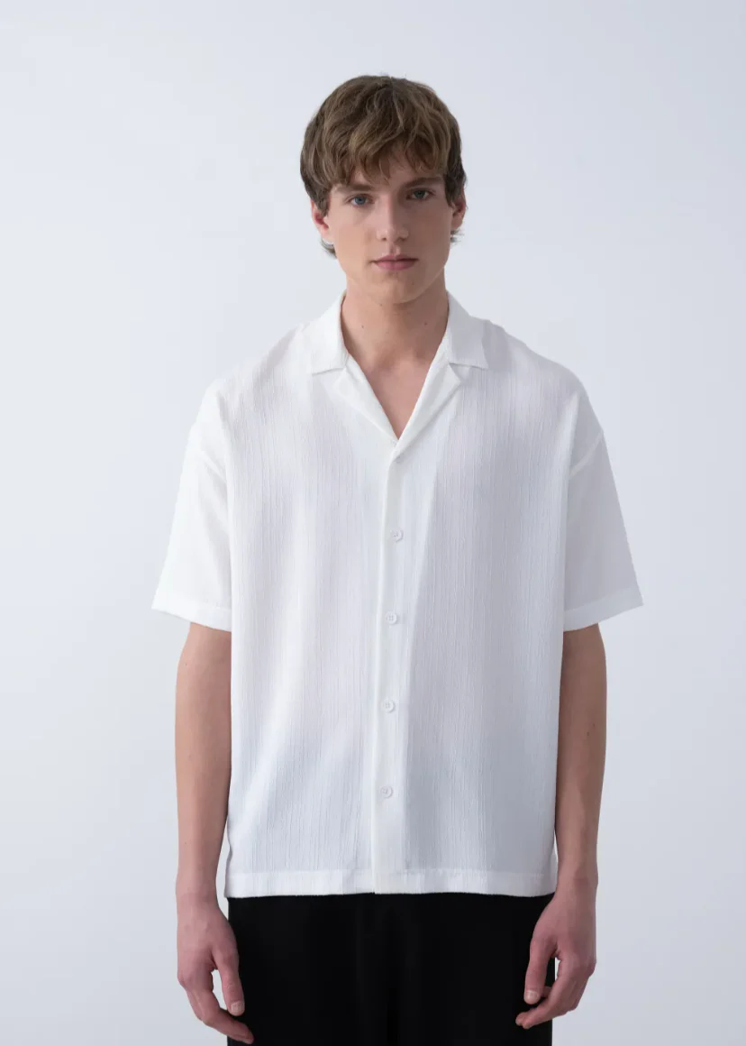 Cette chemisette à texture discrète est la définition du style raffiné et moderne. Sa coupe fluide, son tissu travaillé et son col à revers lui confèrent une allure propre et tendance, idéale pour les journées estivales ou les soirées habillées.
