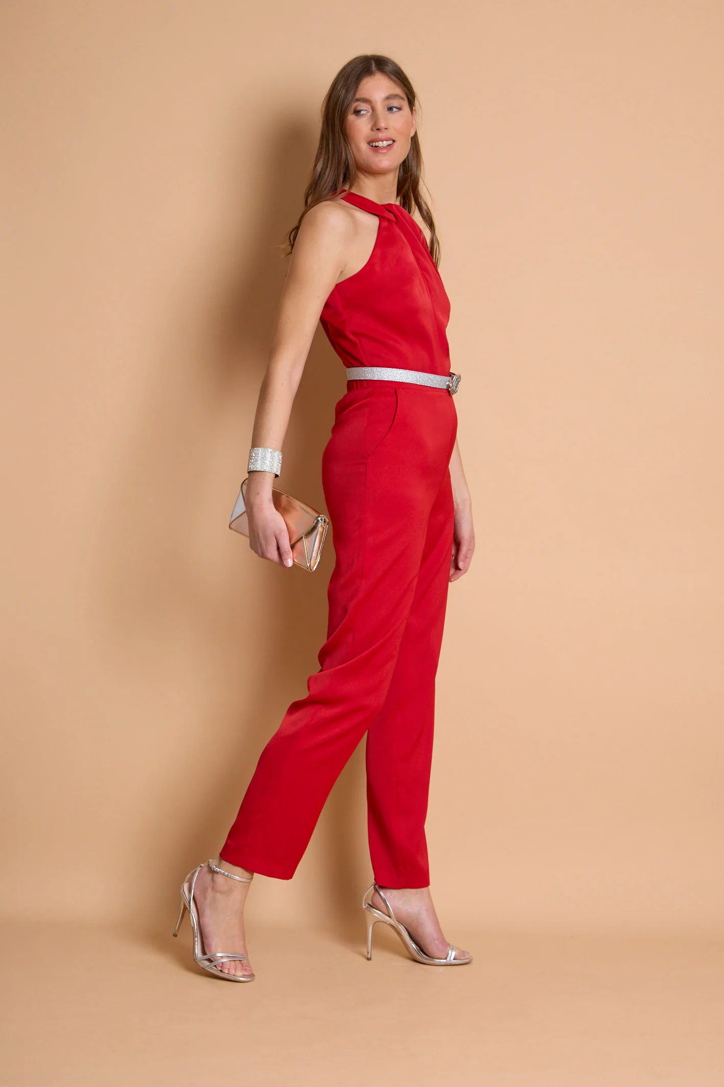 Son tissu en crêpe satin de haute qualité assure un tombé fluide et luxueux, tandis que la teinte rouge intense et audacieuse saura attirer tous les regards. Parfaite pour une soirée élégante ou un événement spécial, cette combinaison se marie idéalement avec des accessoires discrets pour un look raffiné.