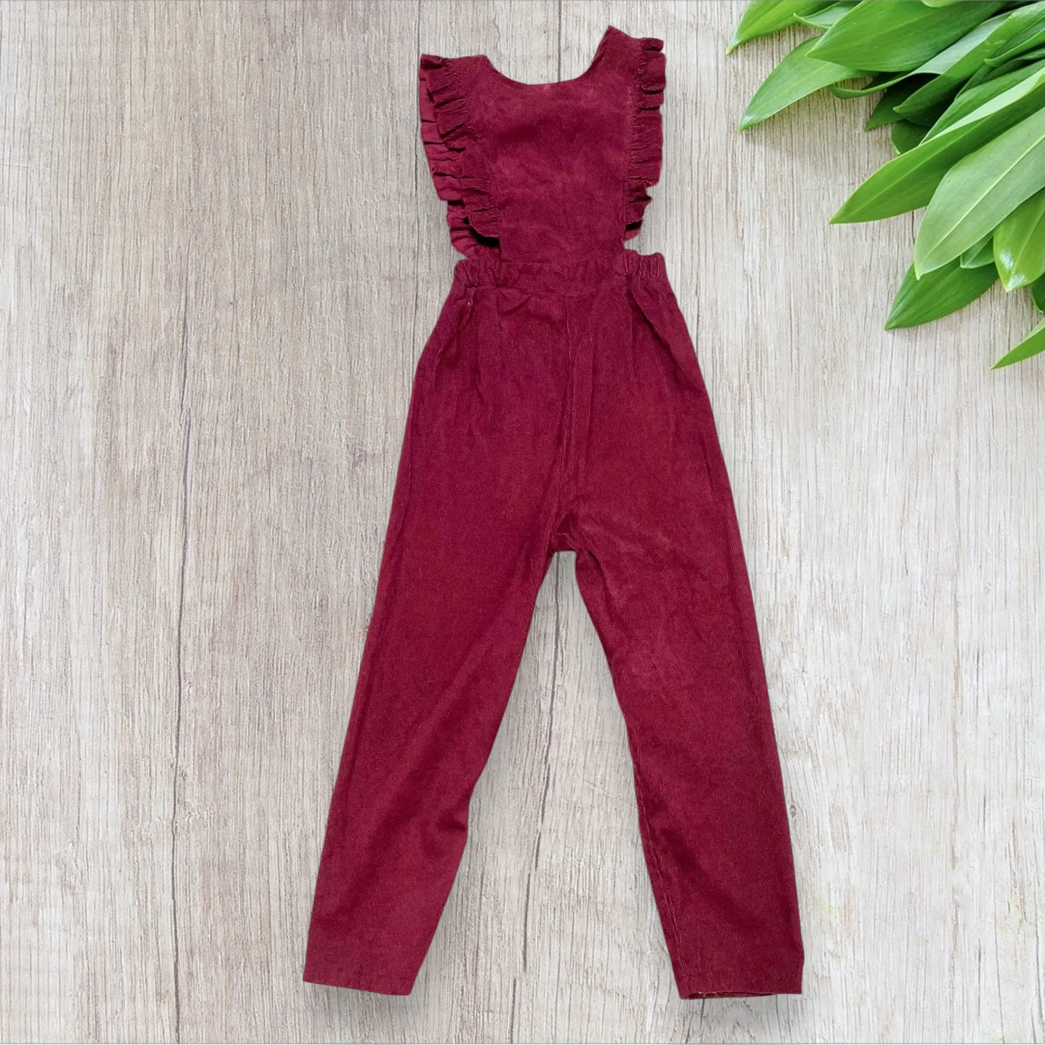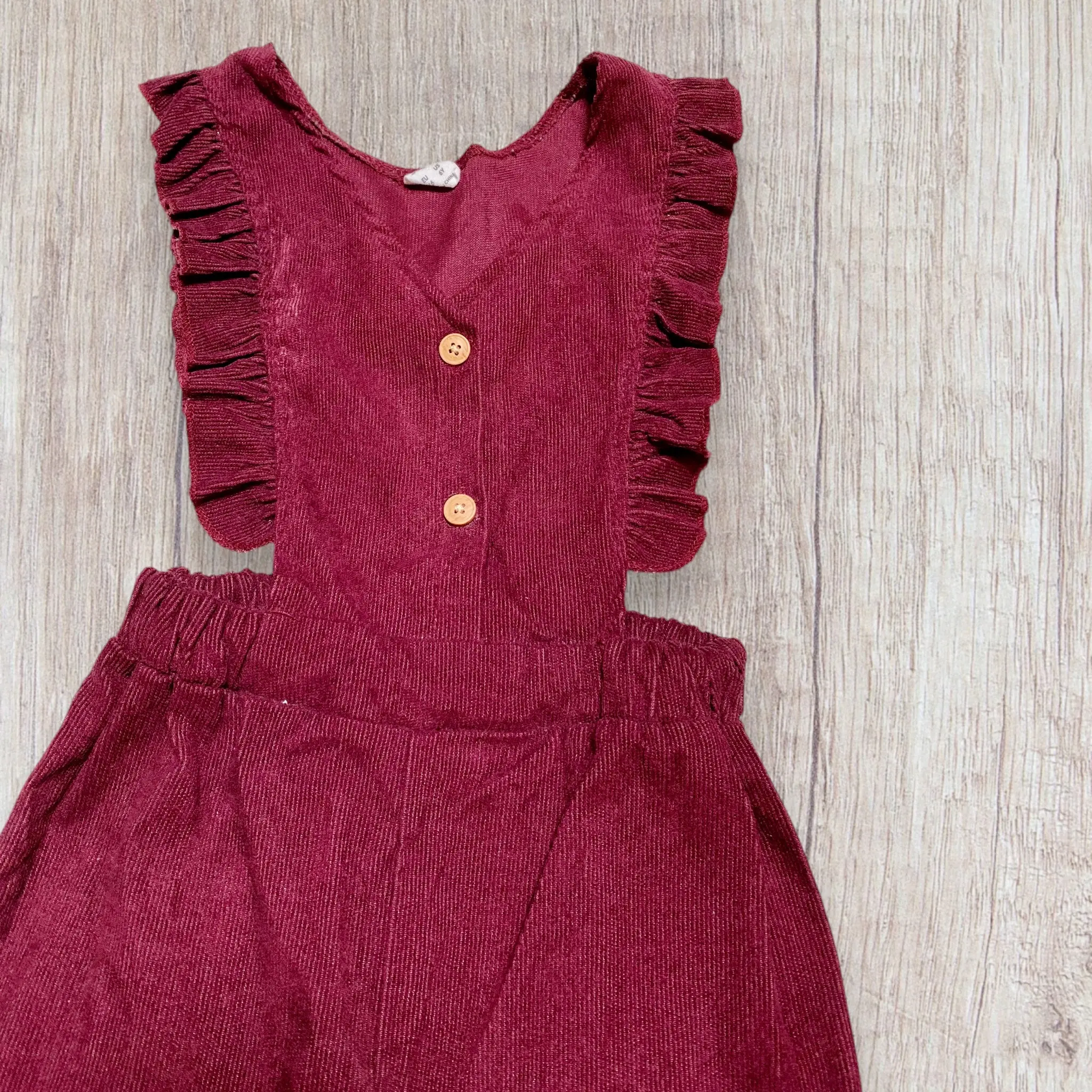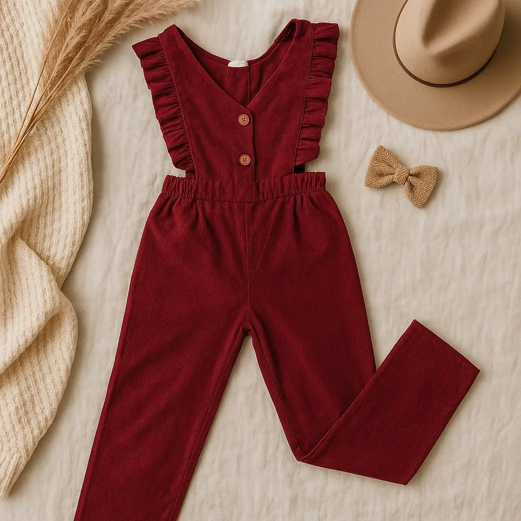 Cette combinaison en velours bordeaux sans manches avec bretelles volants sera un ajout magnifique à la garde-robe de votre fille, lui permettant de se sentir élégante et confortable lors de toutes ses aventures.