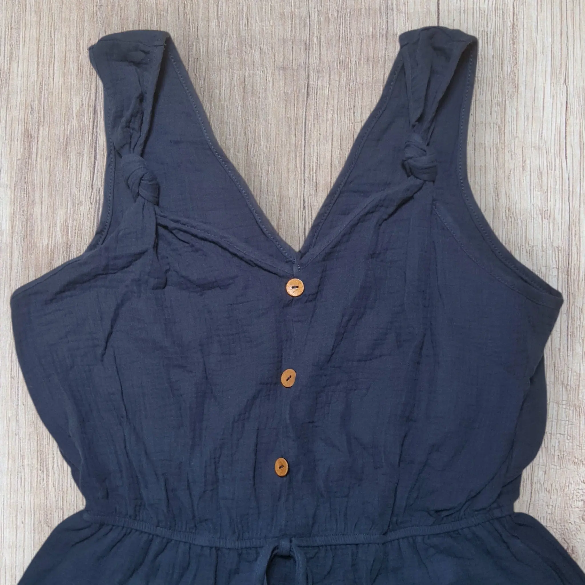 Elle est dotée de bretelles à nœuds, d’un décolleté en V, de trois boutons décoratifs effet bois sur le devant et d’une taille élastiquée avec lien ajustable.