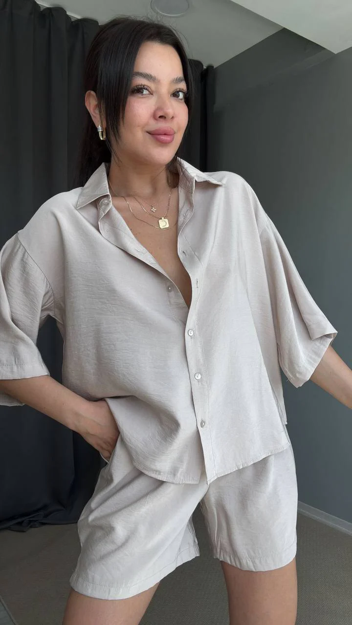 Adoptez un look à la fois minimaliste et confortable avec cet ensemble en lin beige. Composé d’une chemise oversize à manches courtes et d’un short taille élastique, il est parfait pour les journées estivales ou pour une allure chill & chic. À porter ensemble ou séparément pour varier les styles.