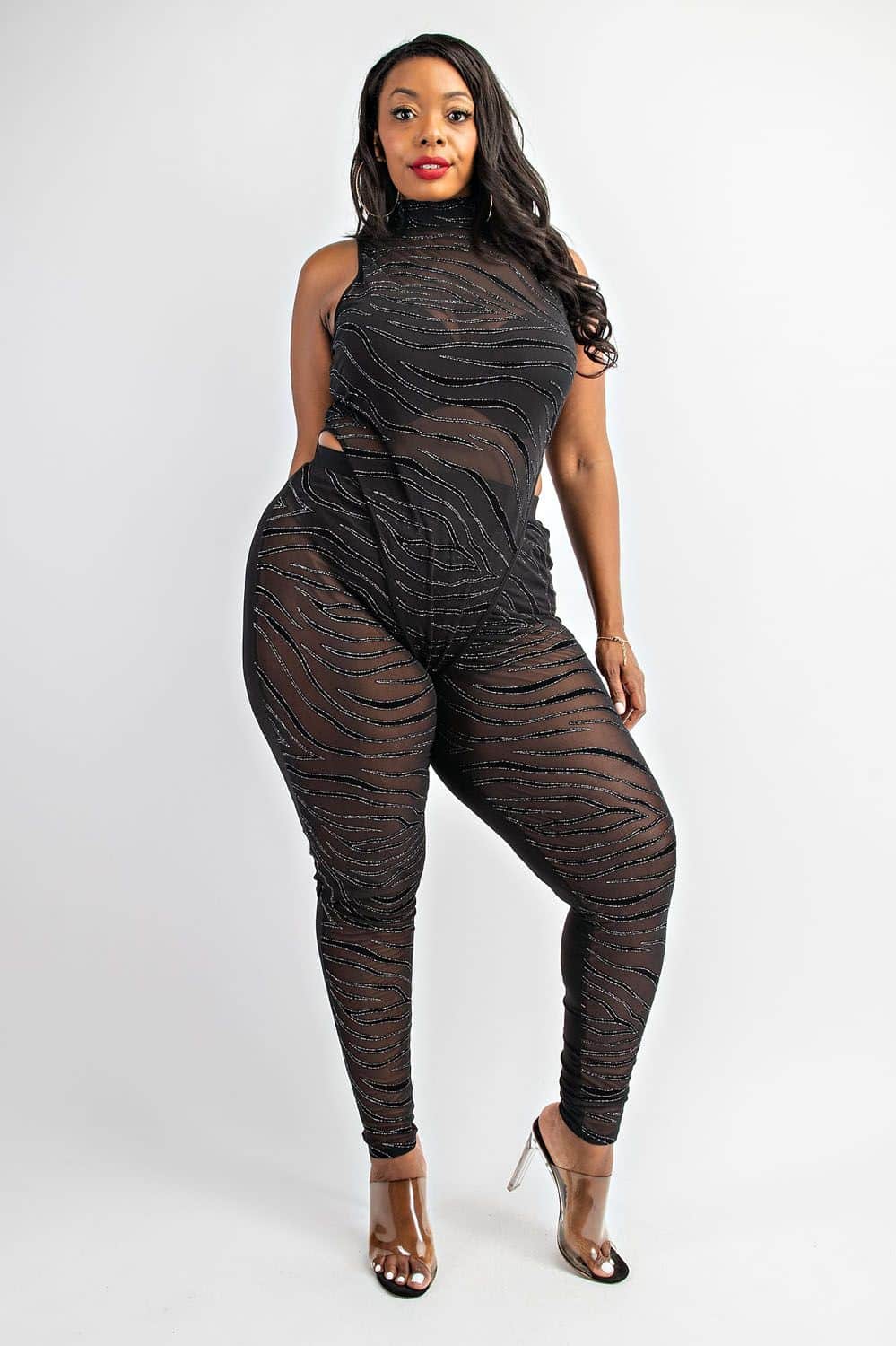Ensemble zébré pailleté body et pantalon Avant à motifs en mesh et arrière noir opaque