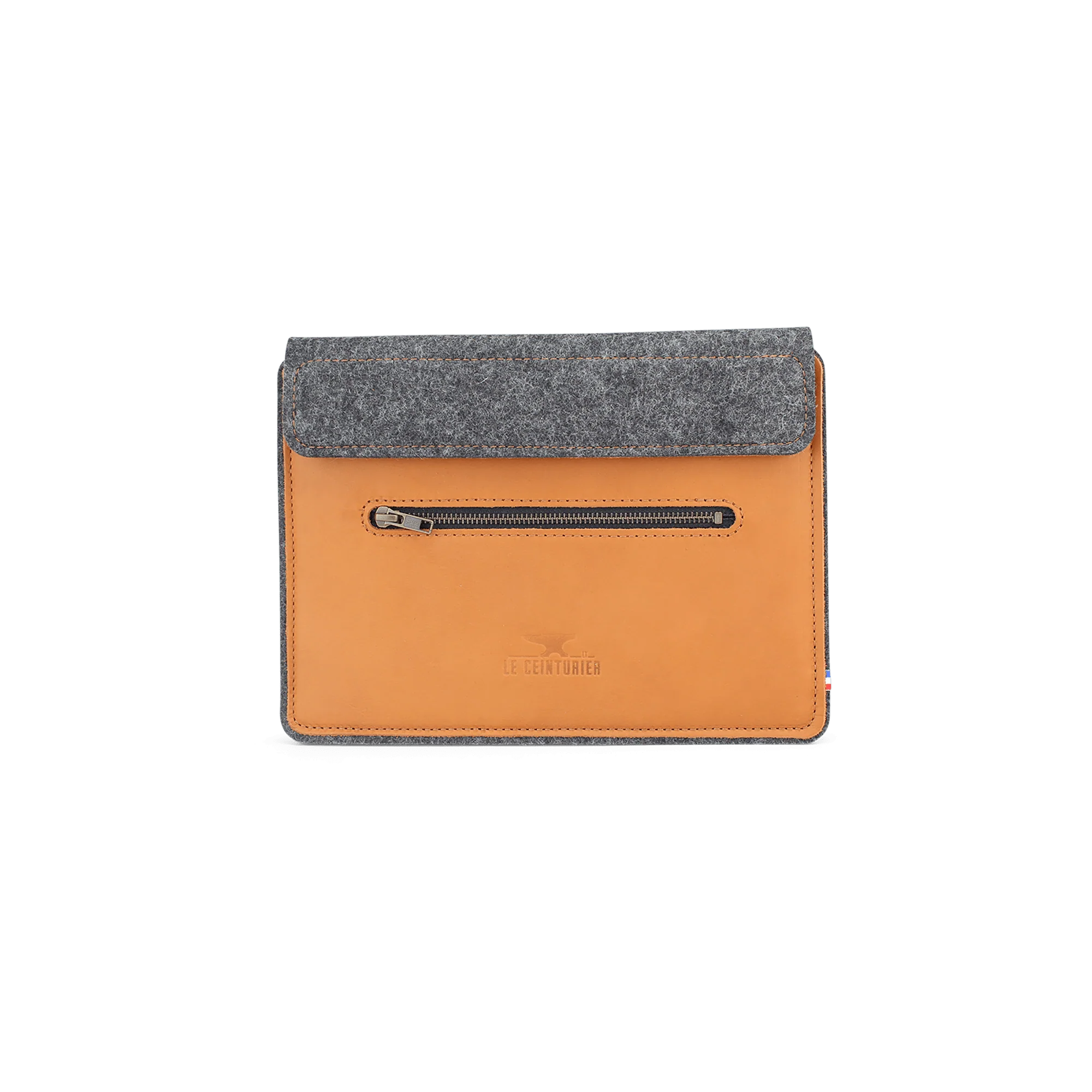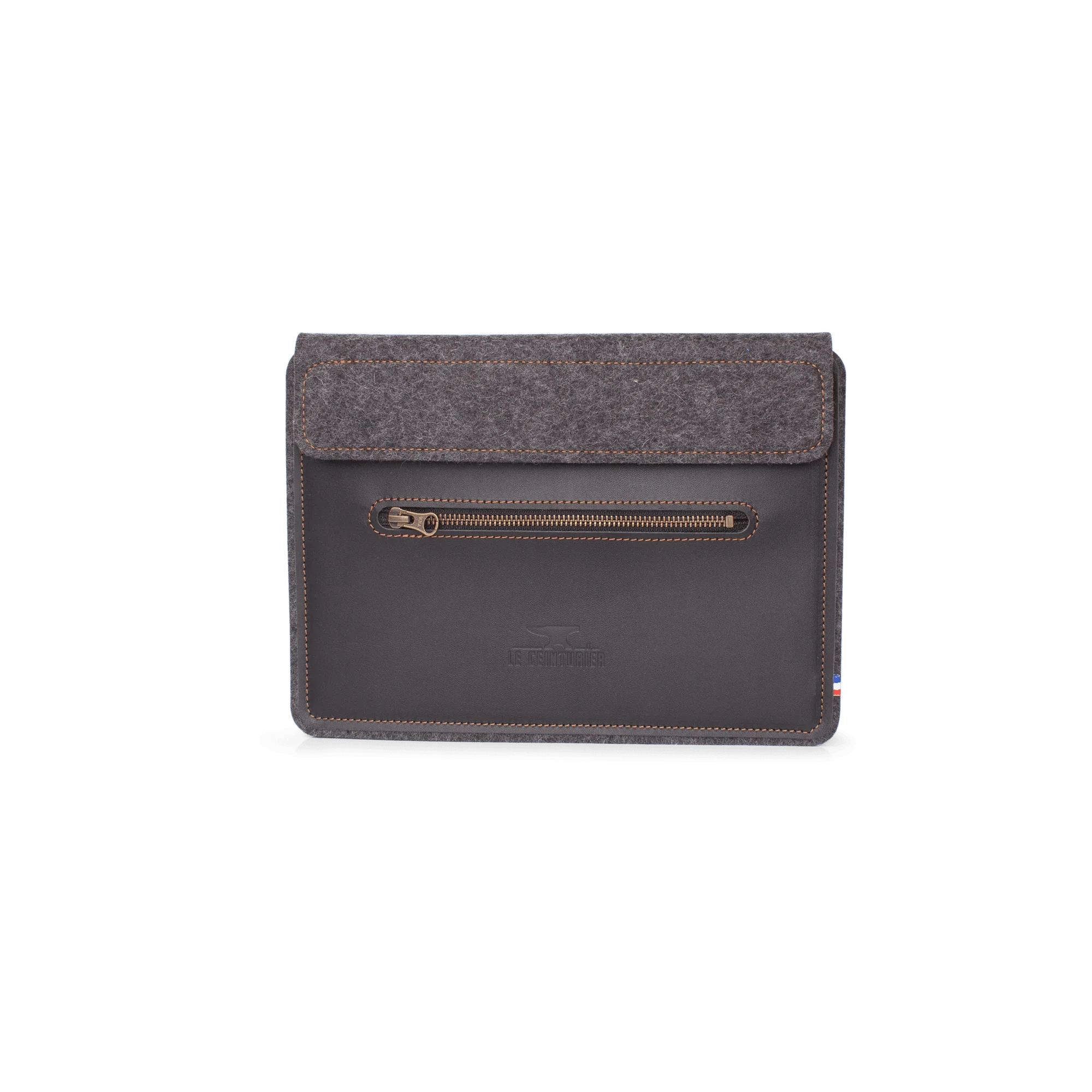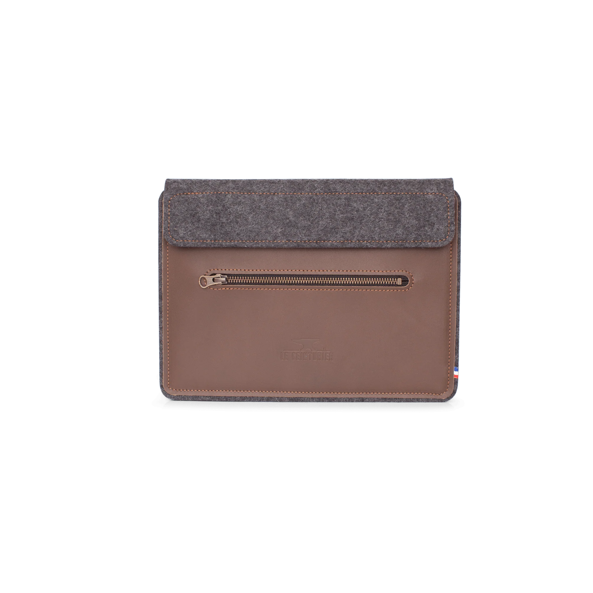 • Cuir origine France tanné en France • Tannage végétal sans sels de chrome • Cuir pleine fleur haut de gamme • Feutre de laine 100% laine Mérinos • Protège des chocs • Conserve un écran propre • Fabriqué en France dans l’atelier Le Ceinturier