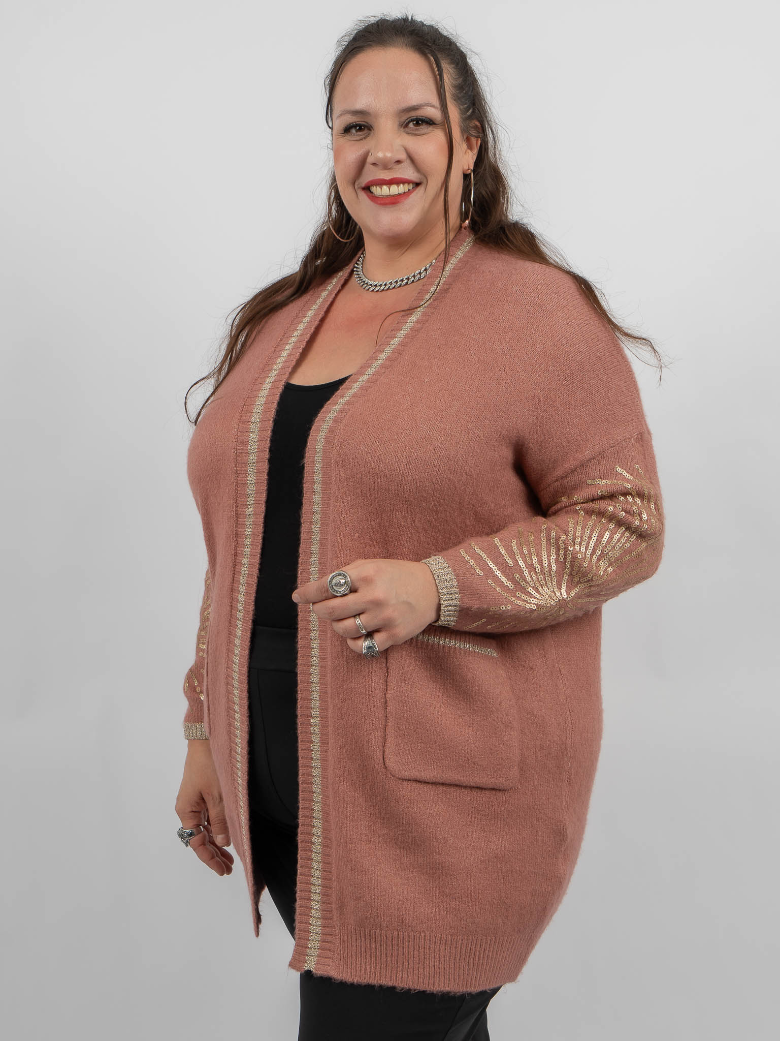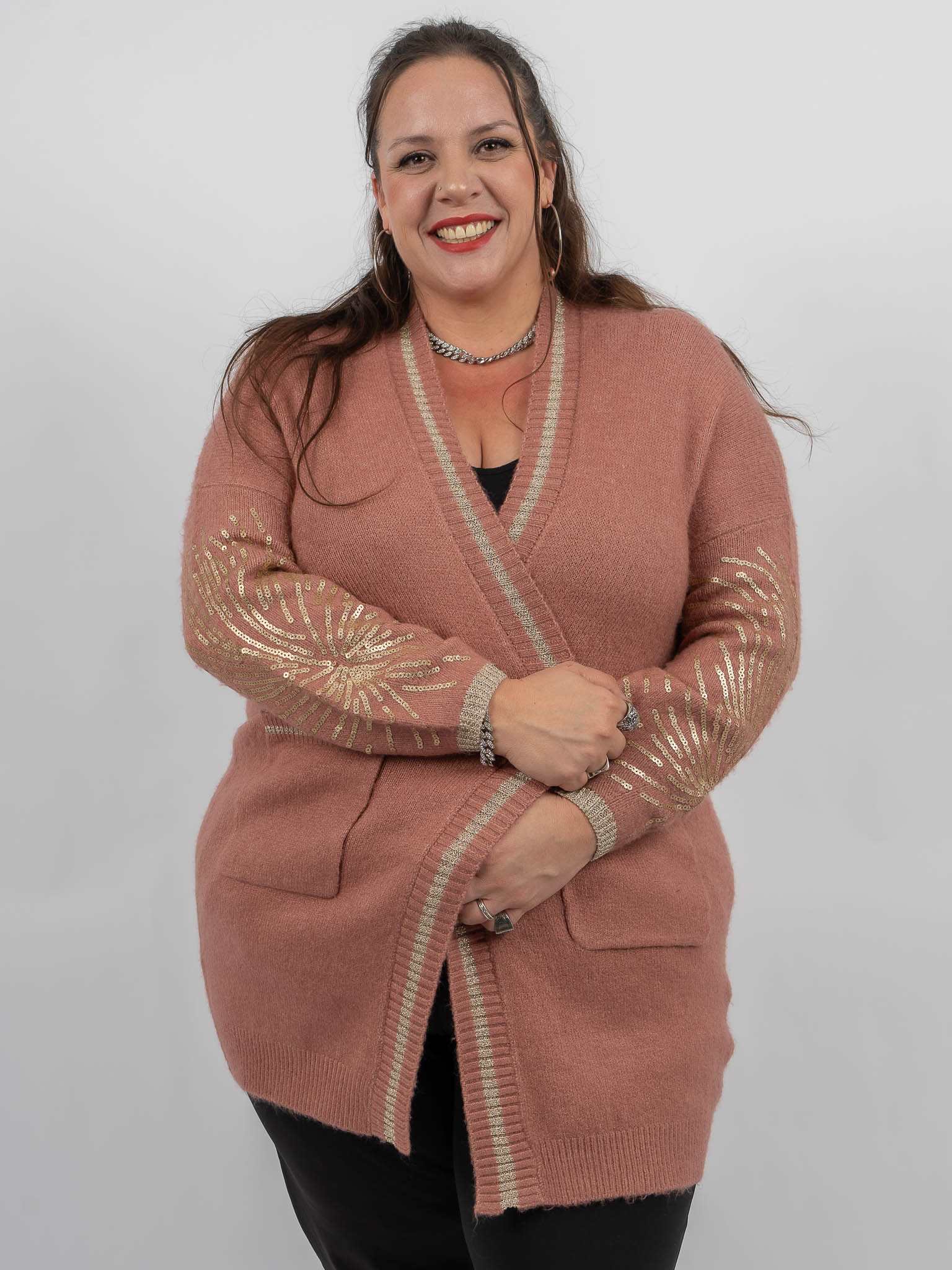 Gilet rose avec sequins aux manches Taille unique convenant jusqu’à la taille 52 Motifs en sequins aux manches Bords avec lurex doré