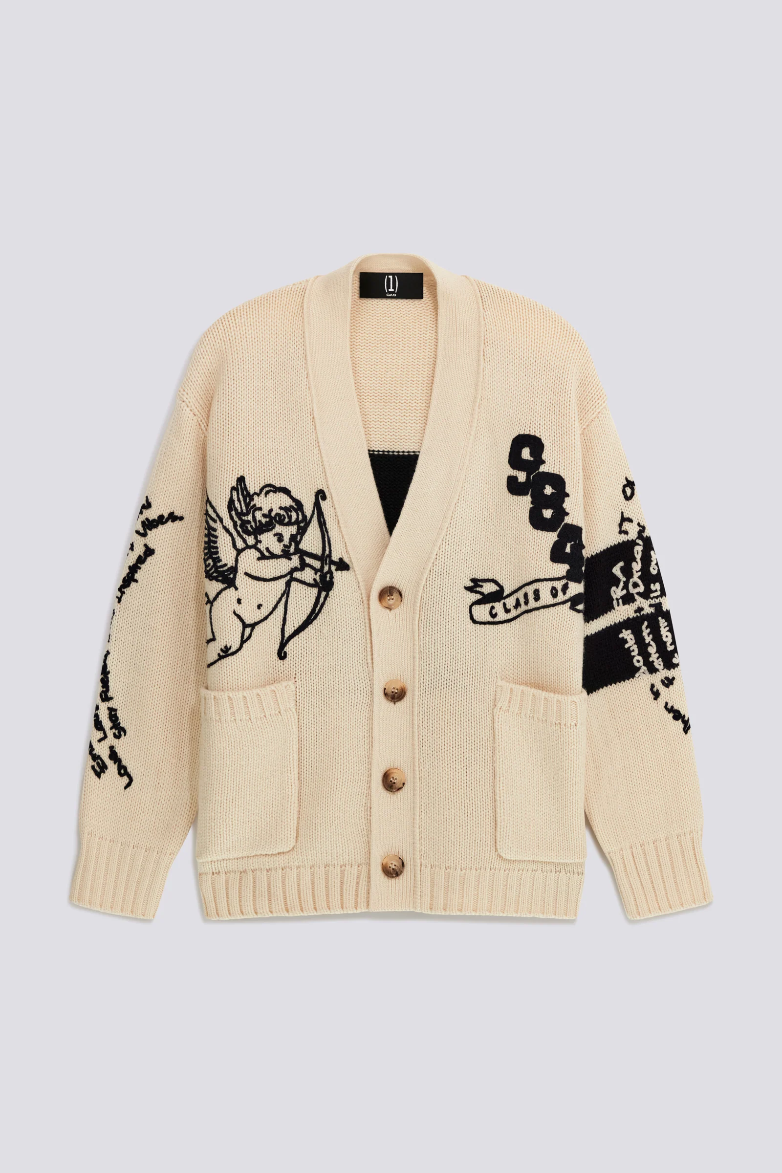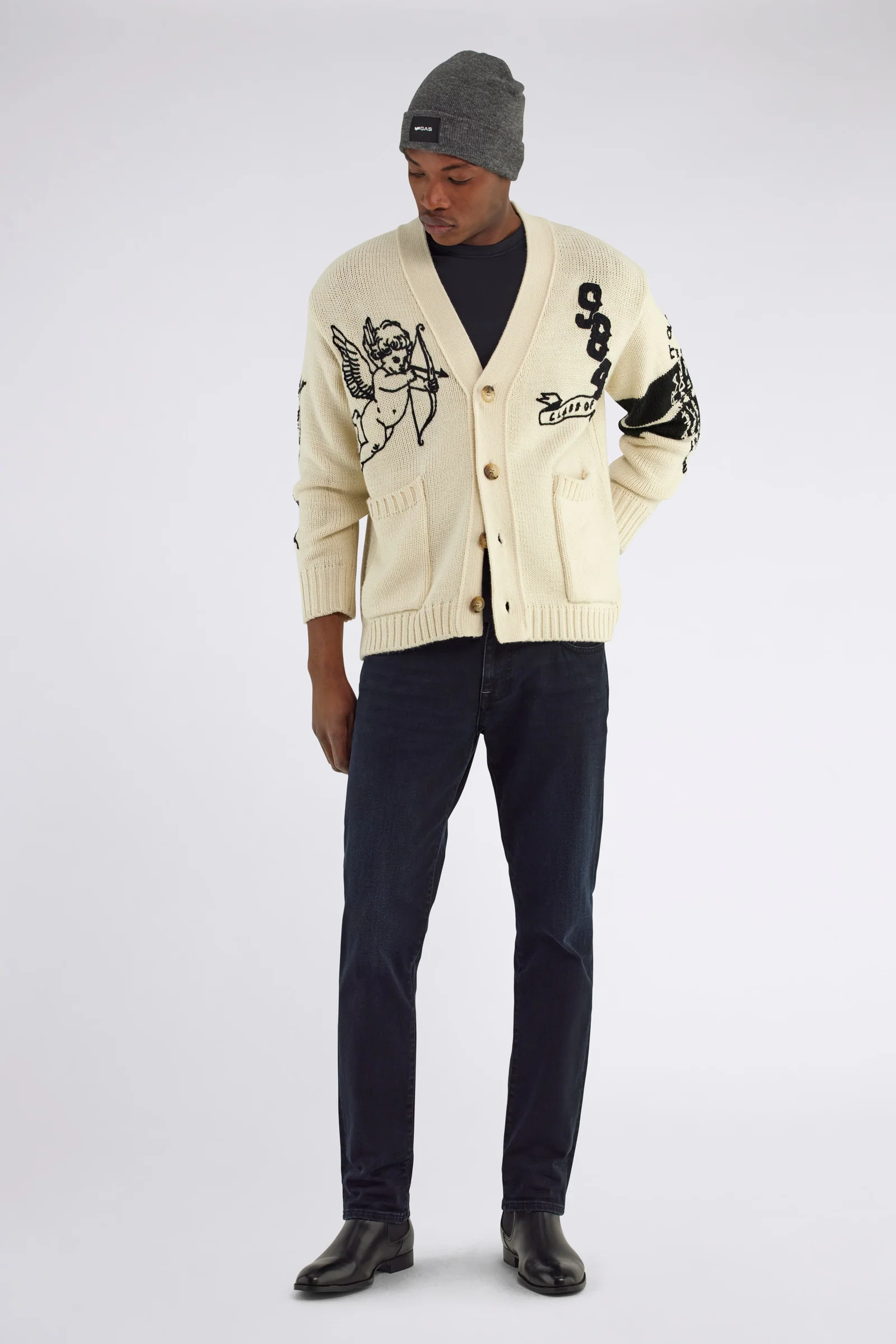 Cardigan comfort fit in soffice filato finezza 5, animato da intarsi grafici e ricami a contrasto che ne esaltano lo stile unico. Perfetto per dare personalità al look e giocare con layer e texture nella stagione fredda.