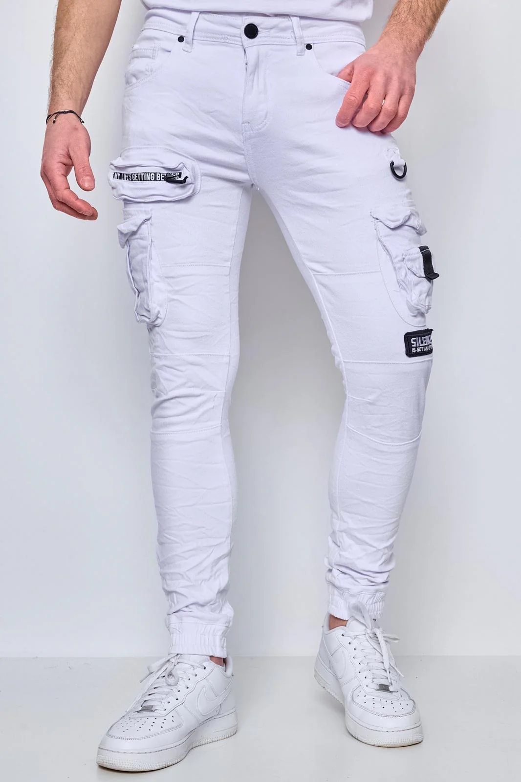 Jean cargo homme Nouvelle Collection E9897• Jean blanc style cargo• Les poches sur les cuisses• Matière confortable• Etiquette certifiant l’authenticité TAILLE ET COUPECoupe cintréeCe produit taille normalementPrenez votre taille habituelleTaille du mannequin principal : 1,82mLe modèle présenté est une taille M COMPOSITION ET ENTRETIENLavable en Machine à 40°