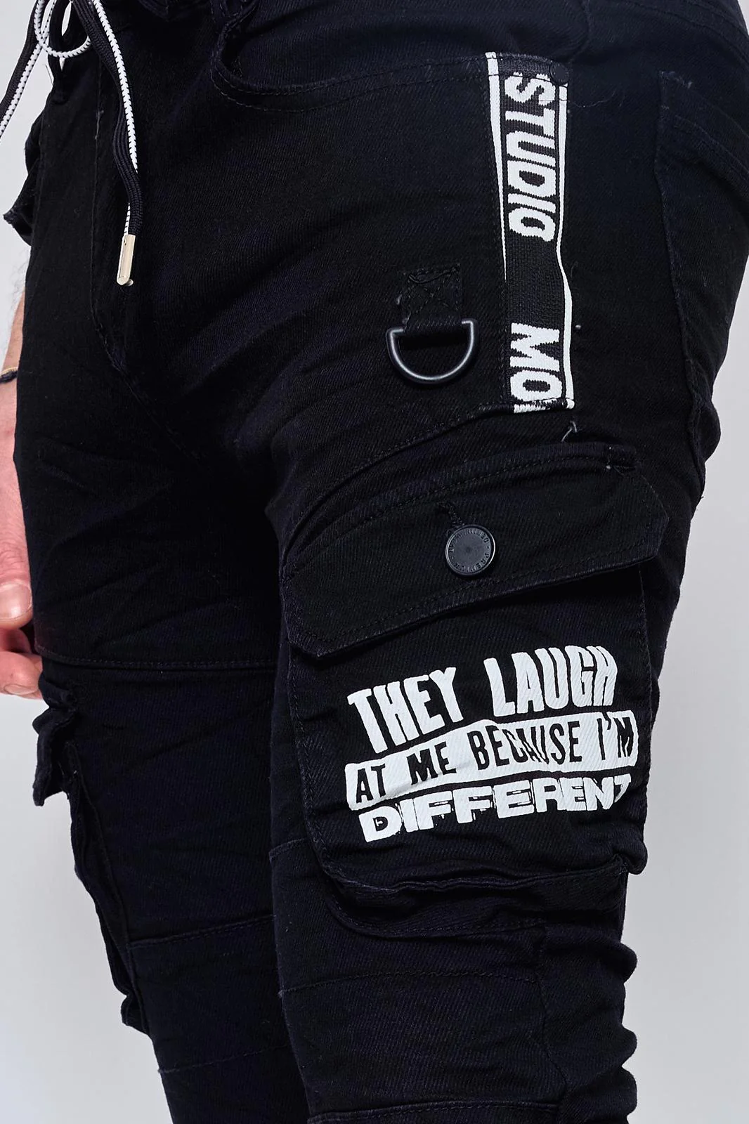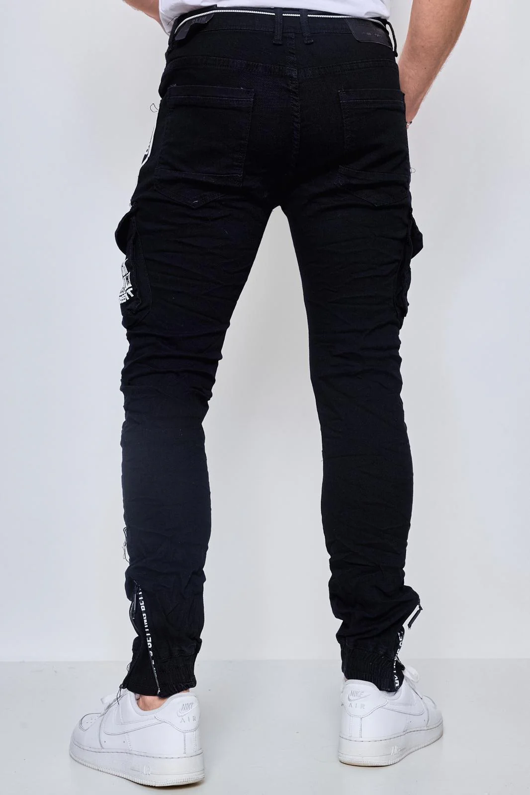 Jean cargo homme • Jean noir style cargo E9896• Deux poches sur les cuisses• Matière confortable• Etiquette certifiant l’authenticité TAILLE ET COUPECoupe cintréeCe produit taille normalementPrenez votre taille habituelleTaille du mannequin principal : 1,82mLe modèle présenté est une taille M COMPOSITION ET ENTRETIENLavable en Machine à 40°