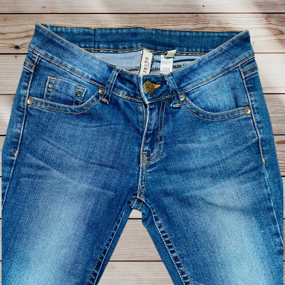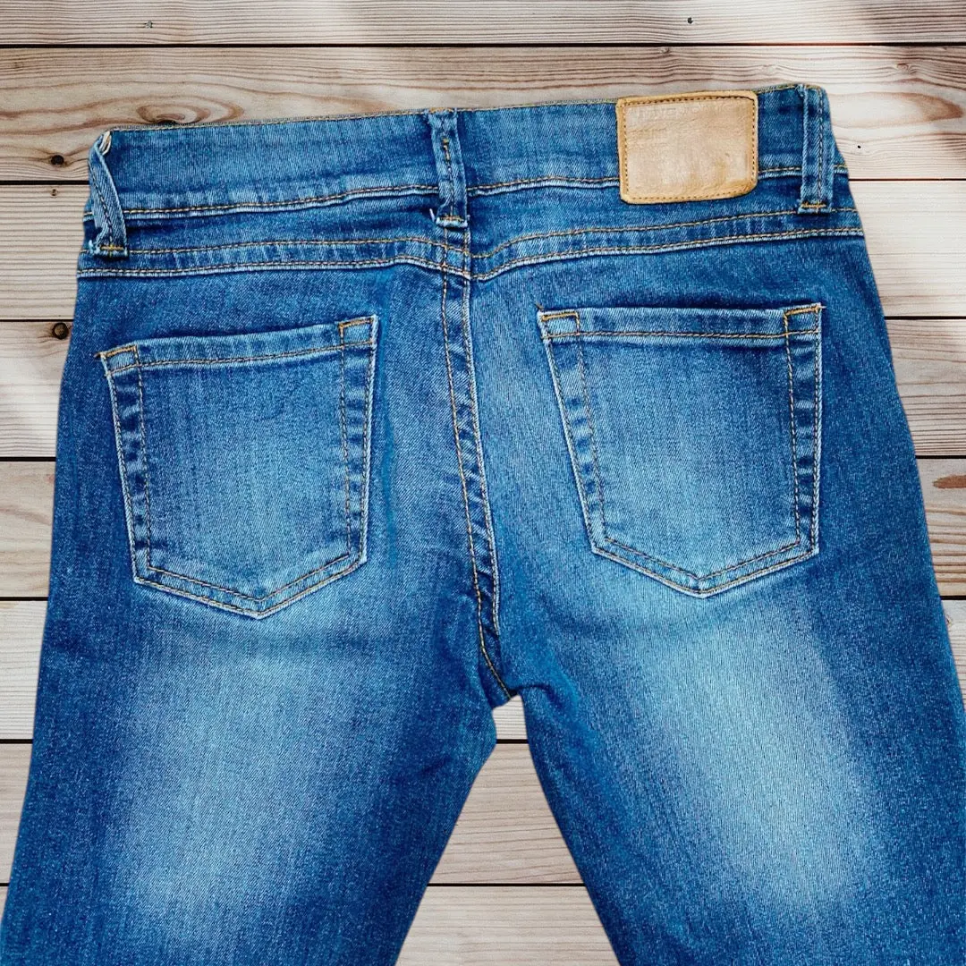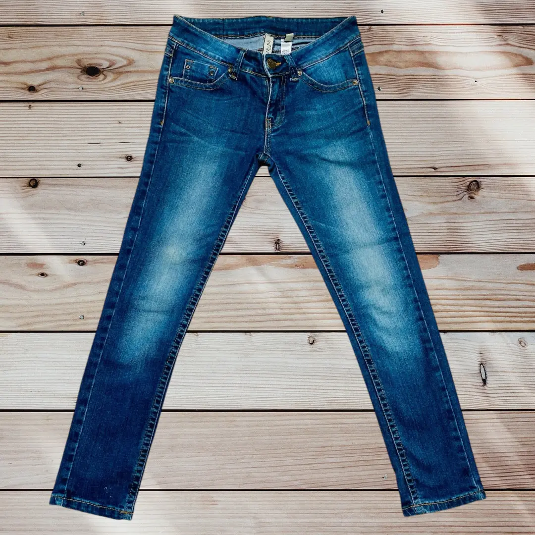 Jean femme slim taille 34 de chez Mango, idéal pour un look casual chic. Ce jean bleu brut avec effet délavé est conçu pour sublimer votre silhouette grâce à sa coupe slim ajustée. Il est doté de poches avant et arrière pratiques, d’une fermeture zippée accompagnée d’un bouton métallique couleur bronze, et d’un jacron discret de la marque au niveau de la taille à l’arrière.