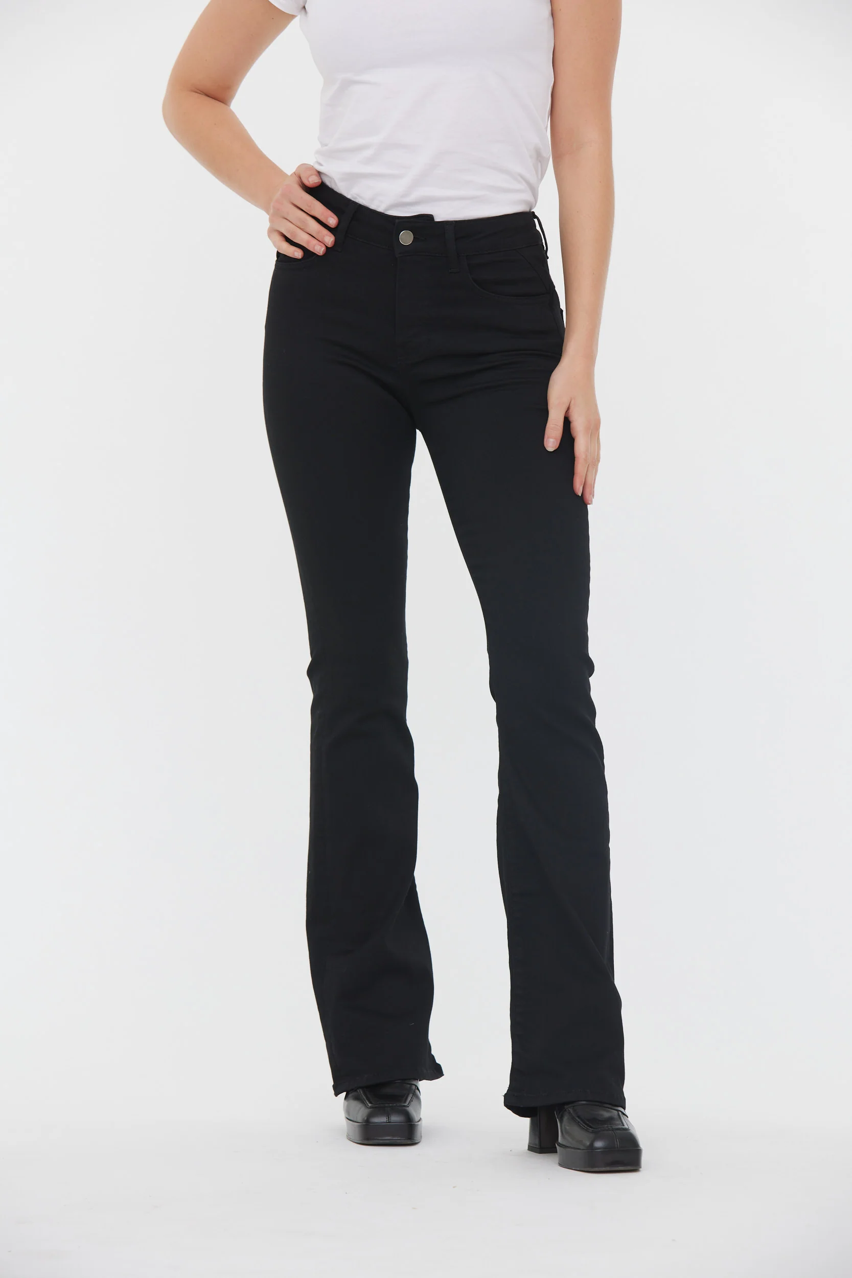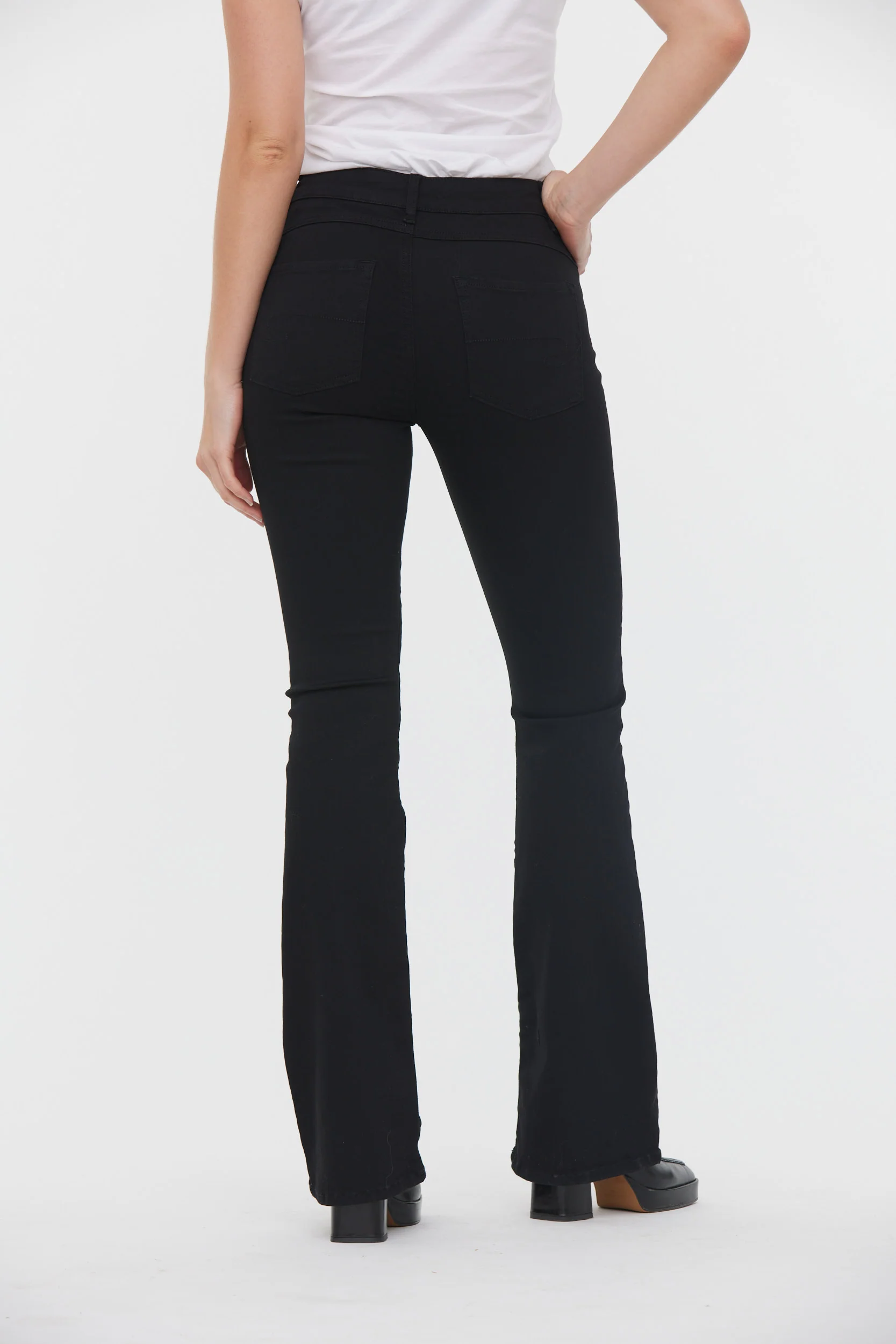 jean noir coupe bootcut, bas de jambe évasé, taille medium. Contient du polyester recyclé Le mannequin mesure 1.70 cm et porte la taille 26