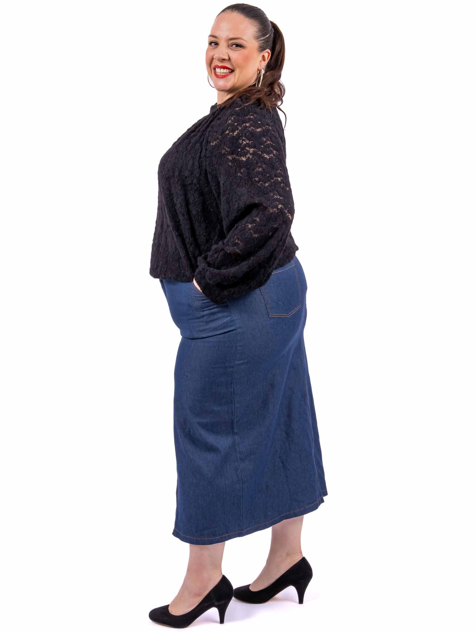 Jupe denim fendue Le modèle taille grand, nous vous conseillons de prendre une taille de dessous de votre taille habituelle