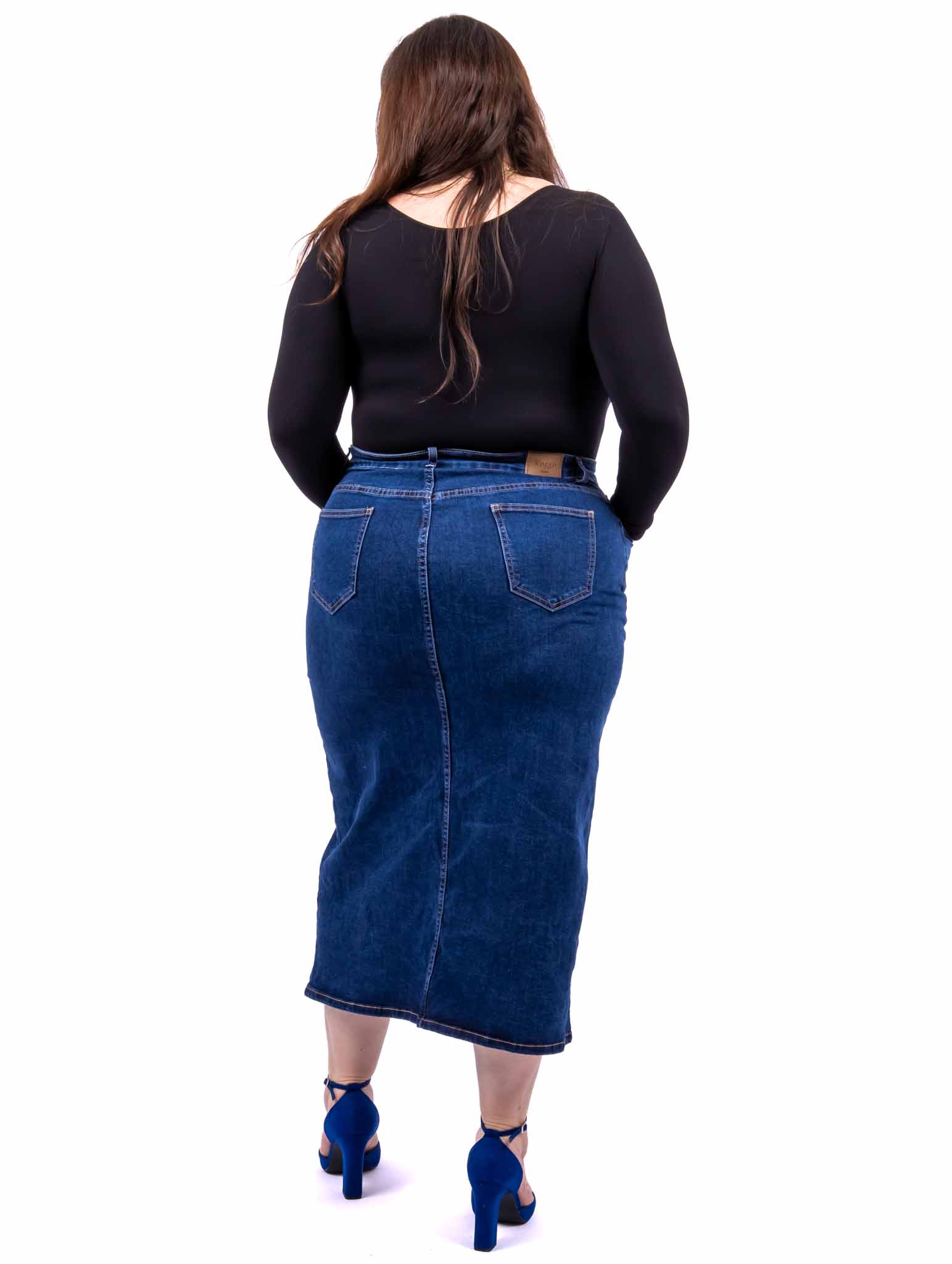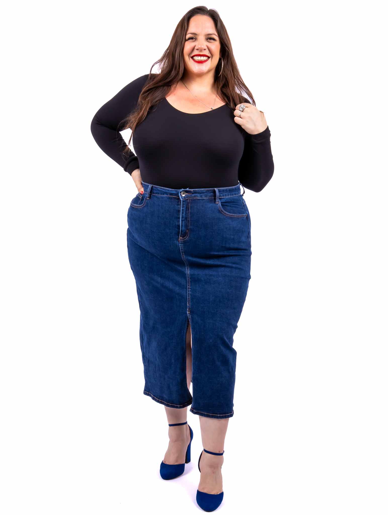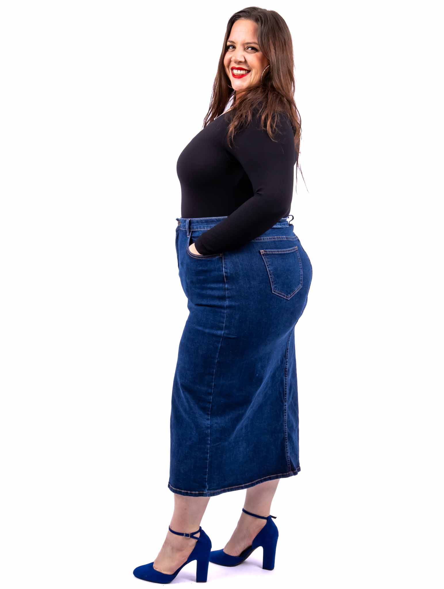 Jupe en jean fendue Taille haute Poches plaquées sur les côtés Poches au dos Passants pour ceinture La jupe taille grand, nous vous conseillons de prendre une taille en dessous de votre taille habituelle Le modèle porte une taille 48 pour une taille 50 habituellement