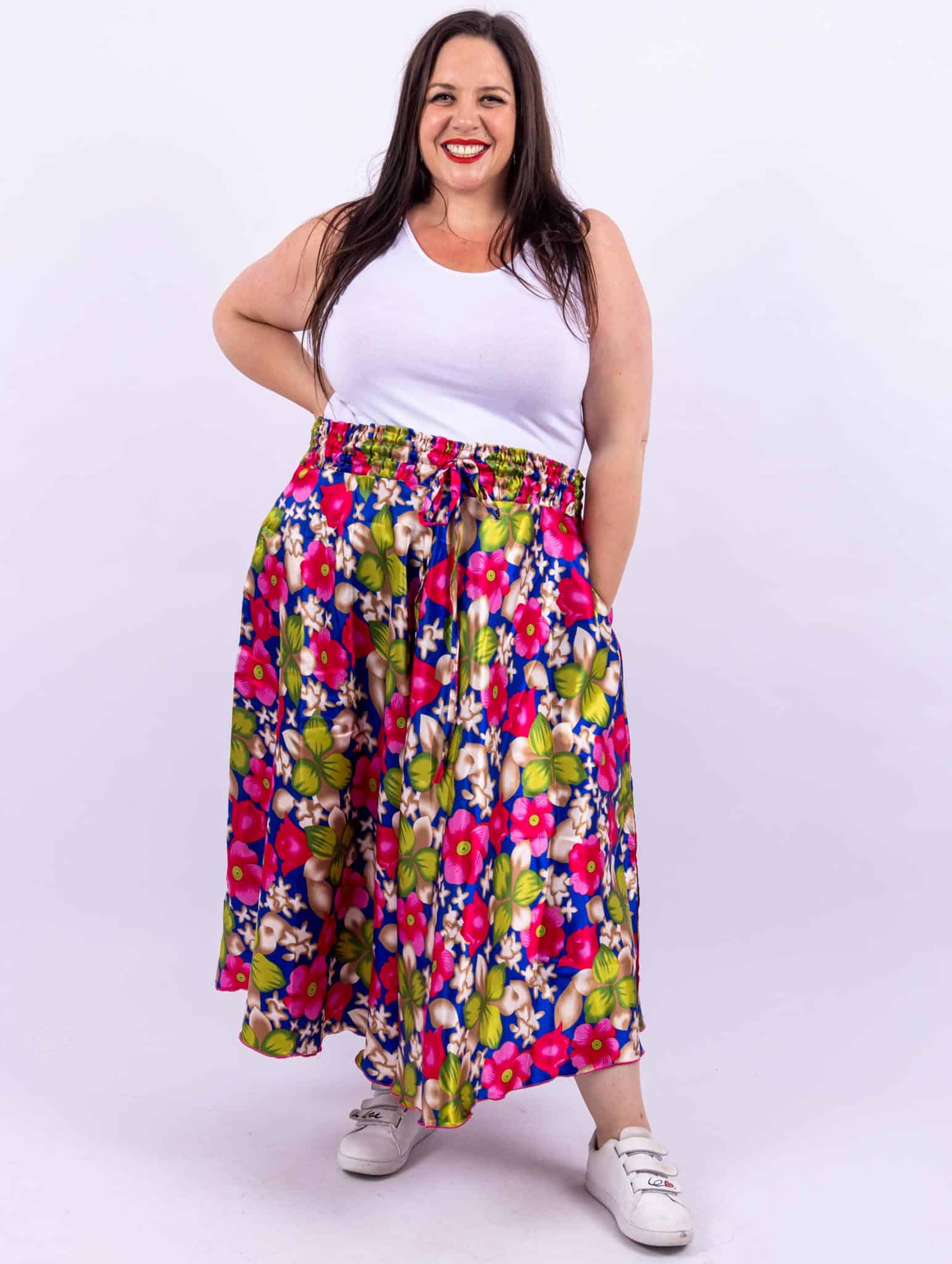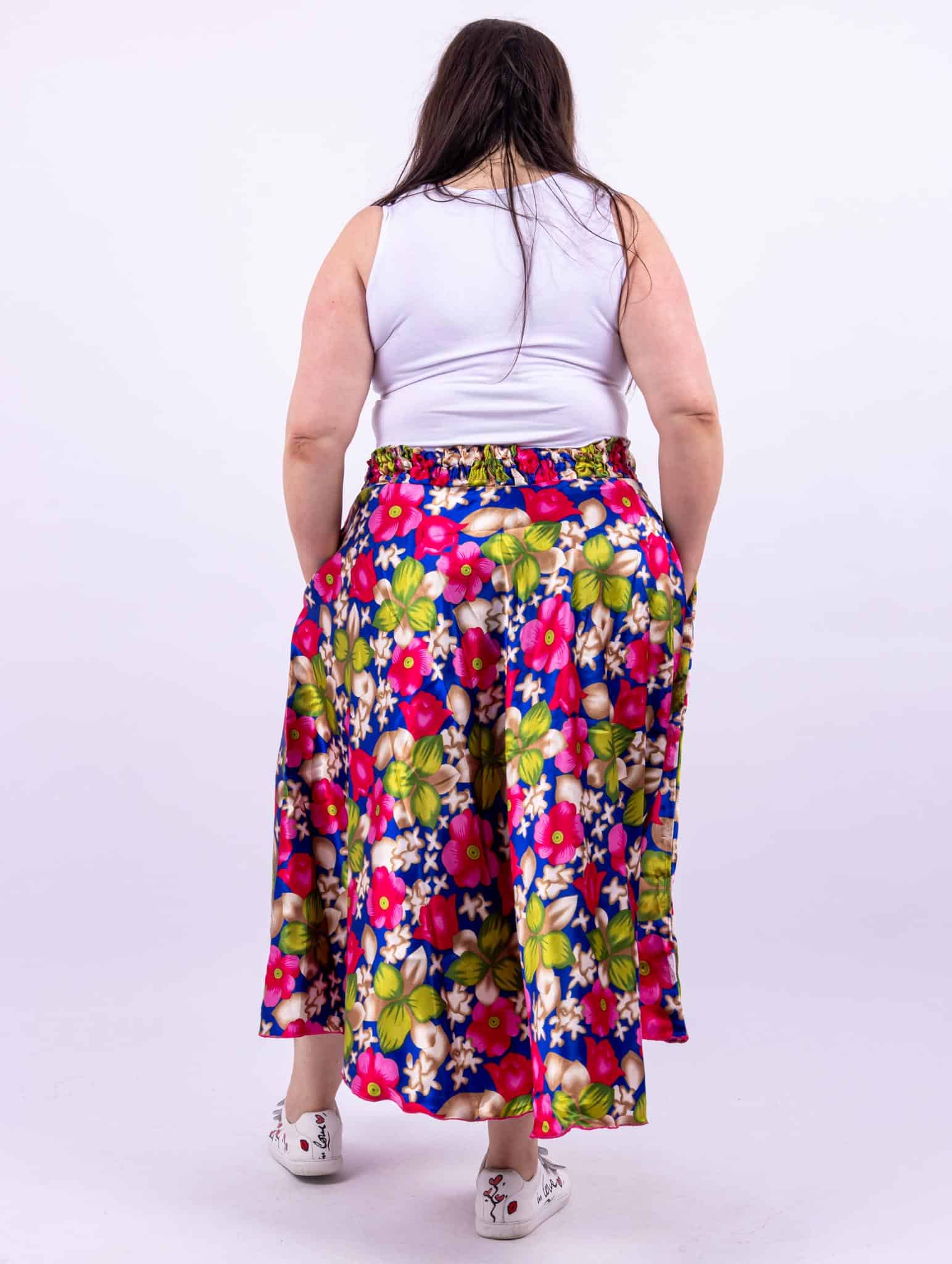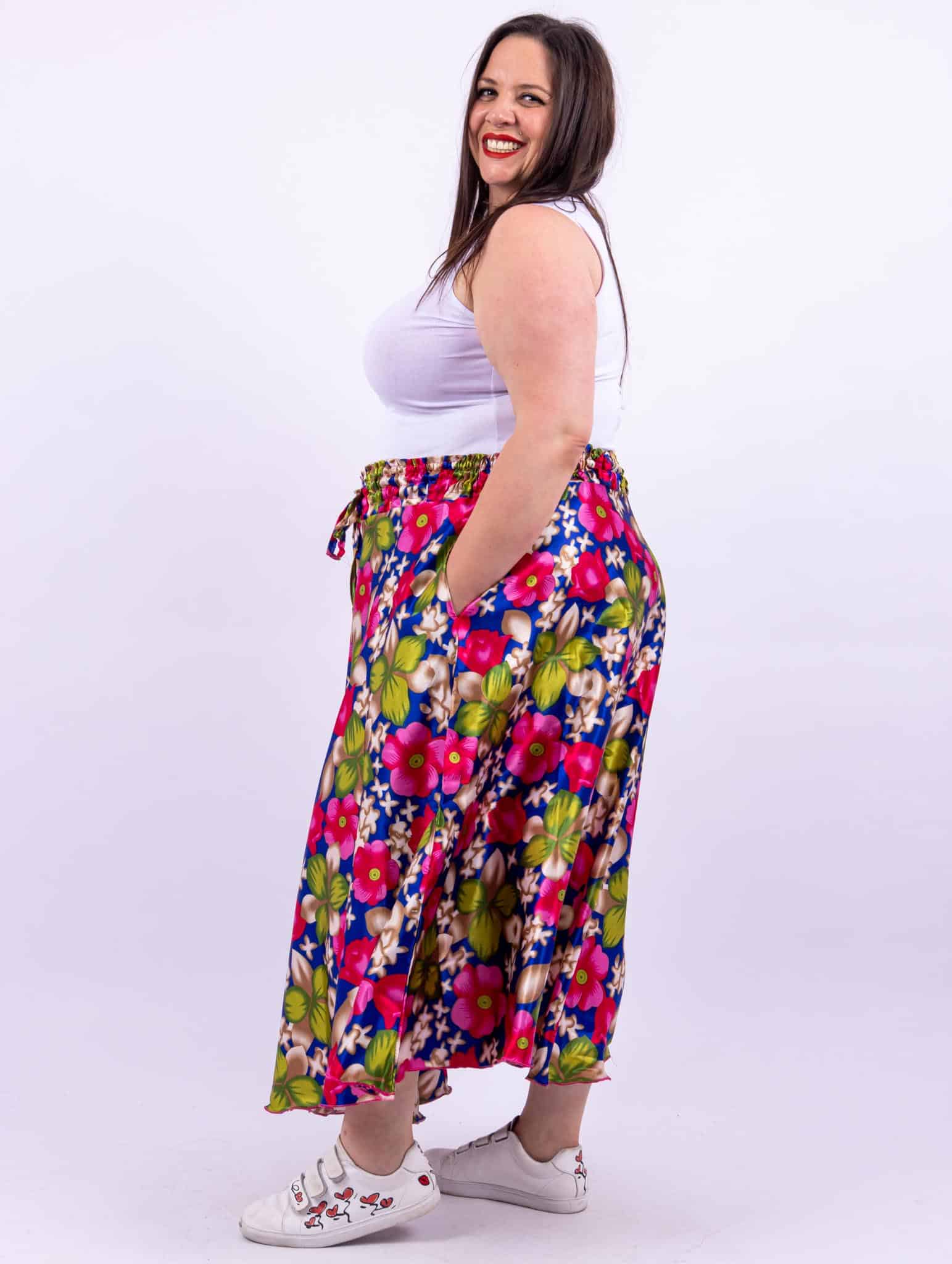 Jupe longue satinée bleu roi imprimé floral Taille élastique à lien pour lui permettre de s’adapter à différentes tailles Poches sur les côtés Bas en coupe vague Taille unique pouvant se porter jusqu’au 54/56