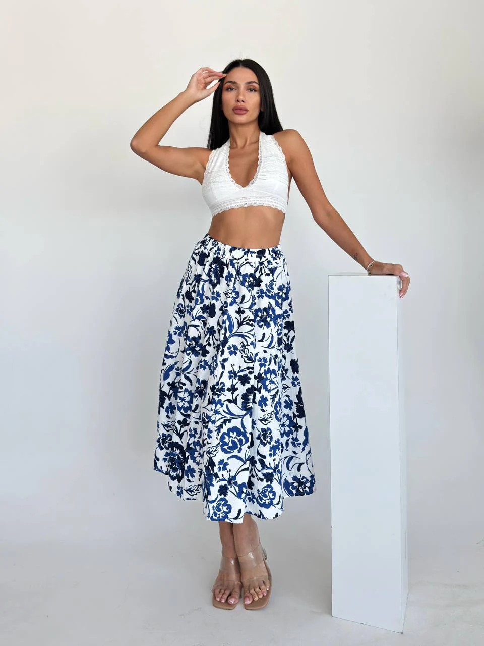 Apportez une touche de fraîcheur à votre garde-robe avec cette jupe midi fluide à imprimé fleuri bleu sur fond blanc. Sa taille élastique offre un confort optimal, tandis que son volume élégant en fait la pièce parfaite pour vos looks d’été.