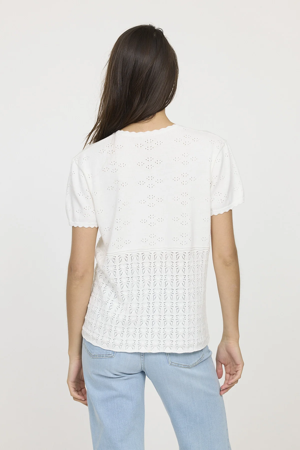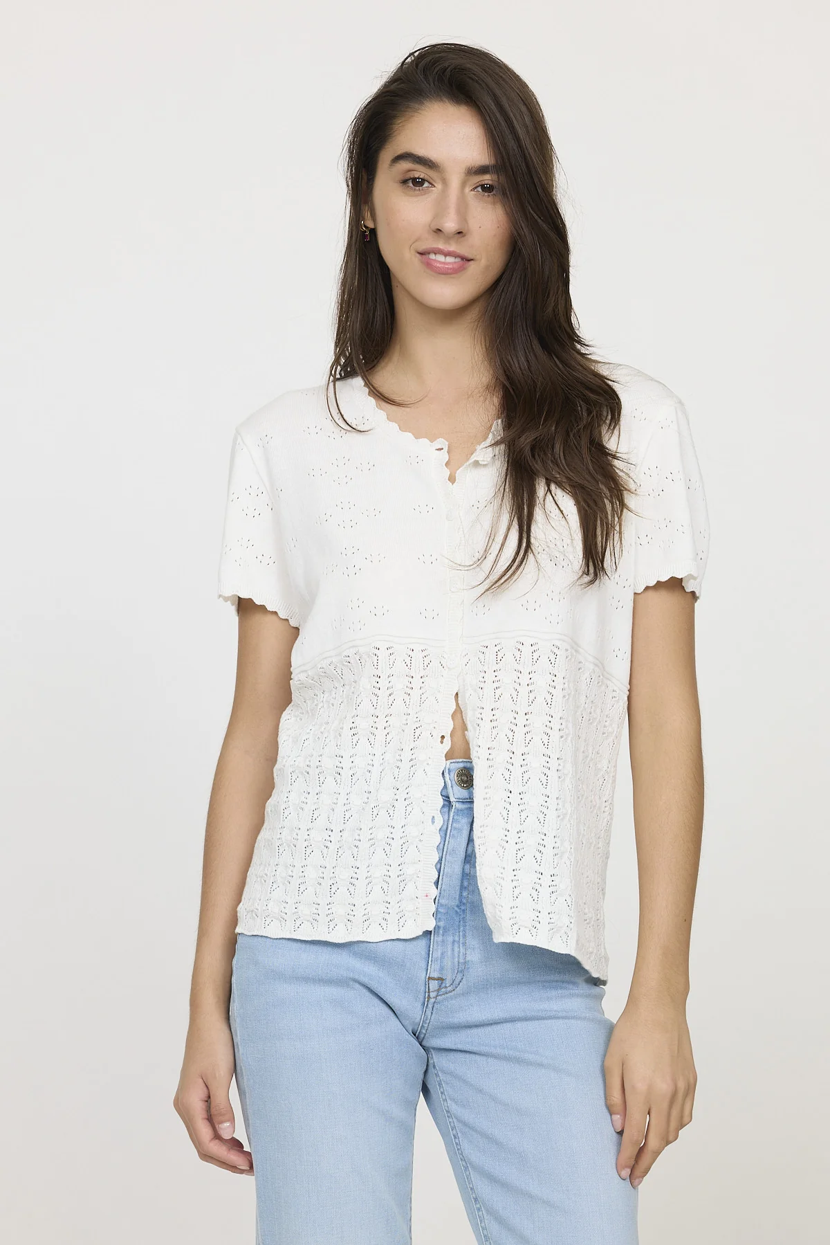 Cardigan femme en maille ajourée allie confort et style dans une pièce à la fois chic et décontractée. Le mannequin mesure 1m75 et porte la taille S