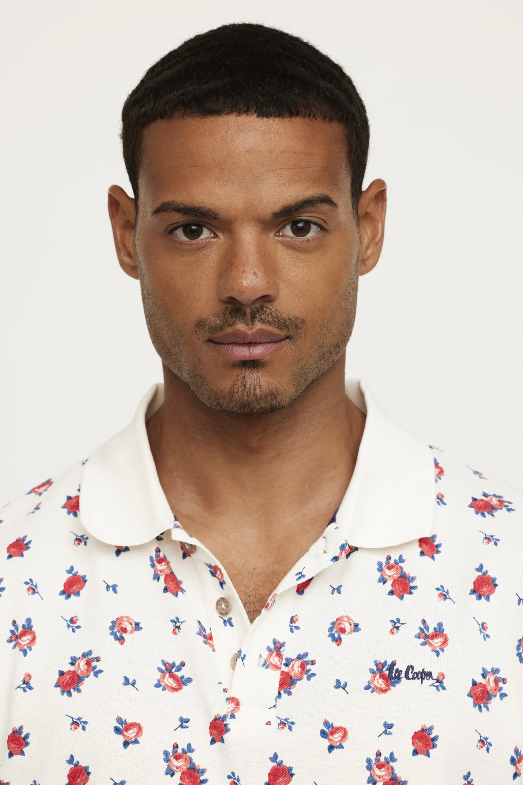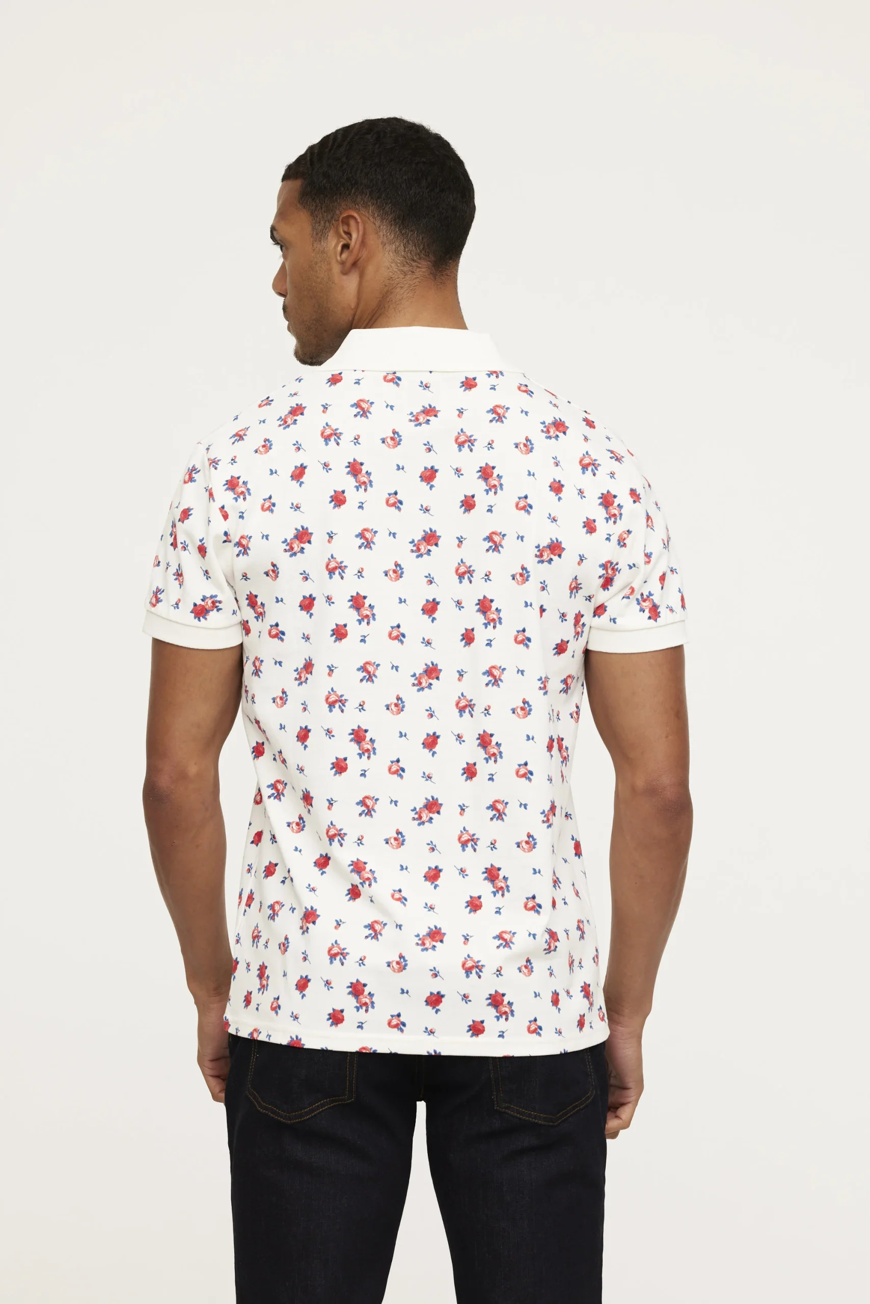Polo en coton piqué allover « Petites fleurs » avec broderie poitrine Le mannequin mesure 1m85 et porte la taille M