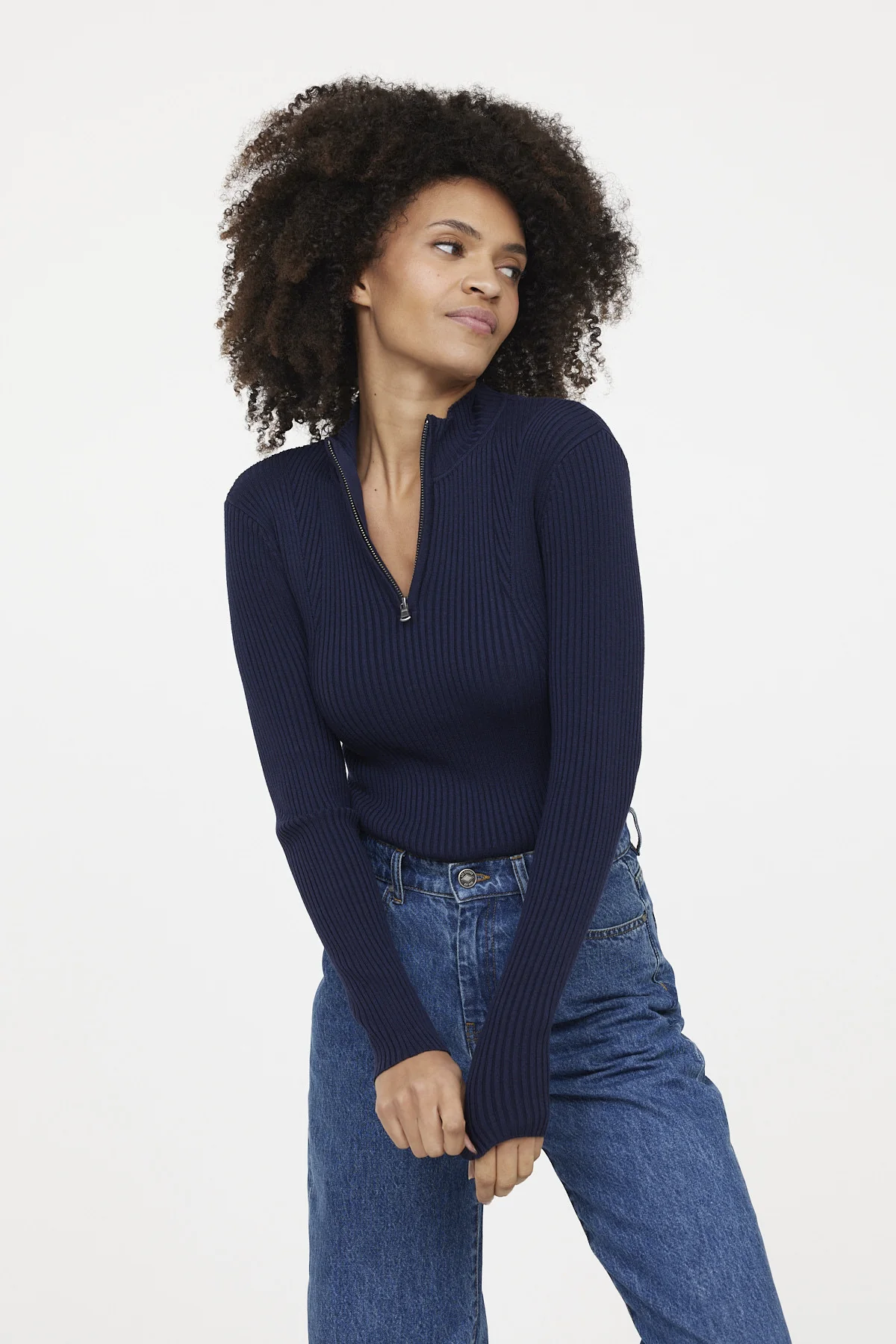 Pull en maille pour femme, doté d’un col montant zippé permettant e moduler l’ouverture selon vos préférences, coupe slim spécialement conçue pour épouser et flatter la silhouette féminine Le mannequin mesure 1m70 et porte la taille S