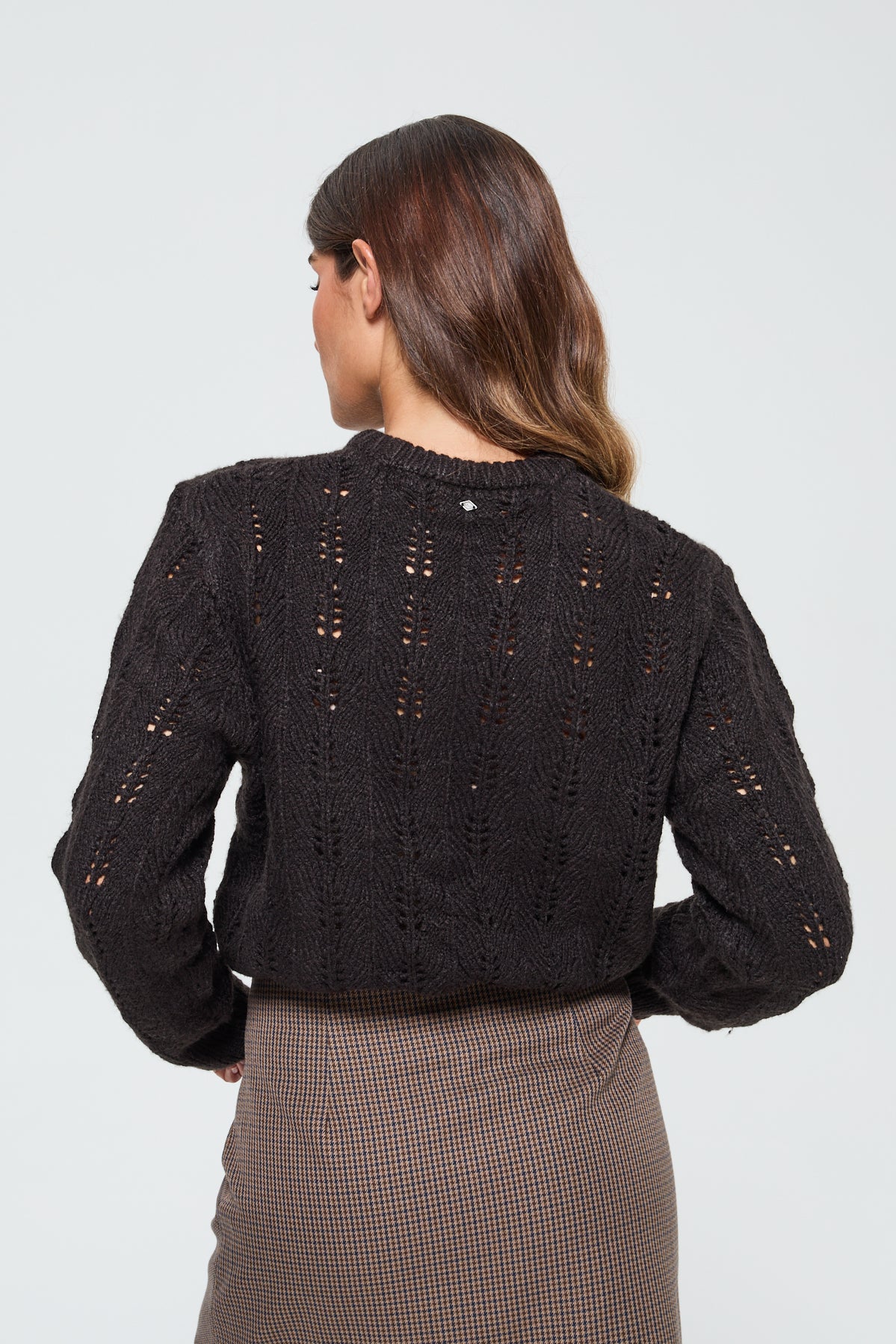 Doté d’un col rond classique et de manches longues, il présente une coupe comfort qui permet de le porter facilement tout au long de la journée. La maille ajourée apporte une touche aérée et moderne, idéale pour un look à la fois chic et décontracté.