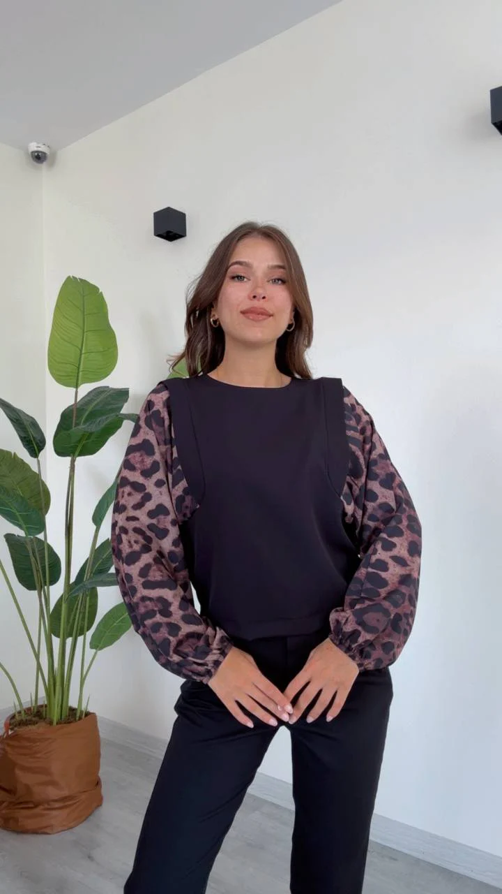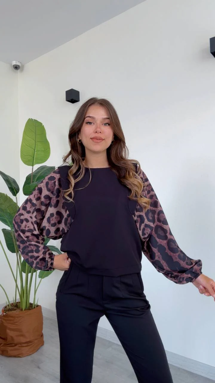 • Manches ballon en voile imprimé léopard : Les manches légères et légèrement transparentes présentent un imprimé léopard, apportant une touche sauvage et tendance. Ces manches ballon donnent du volume et du mouvement, ajoutant du caractère au vêtement.