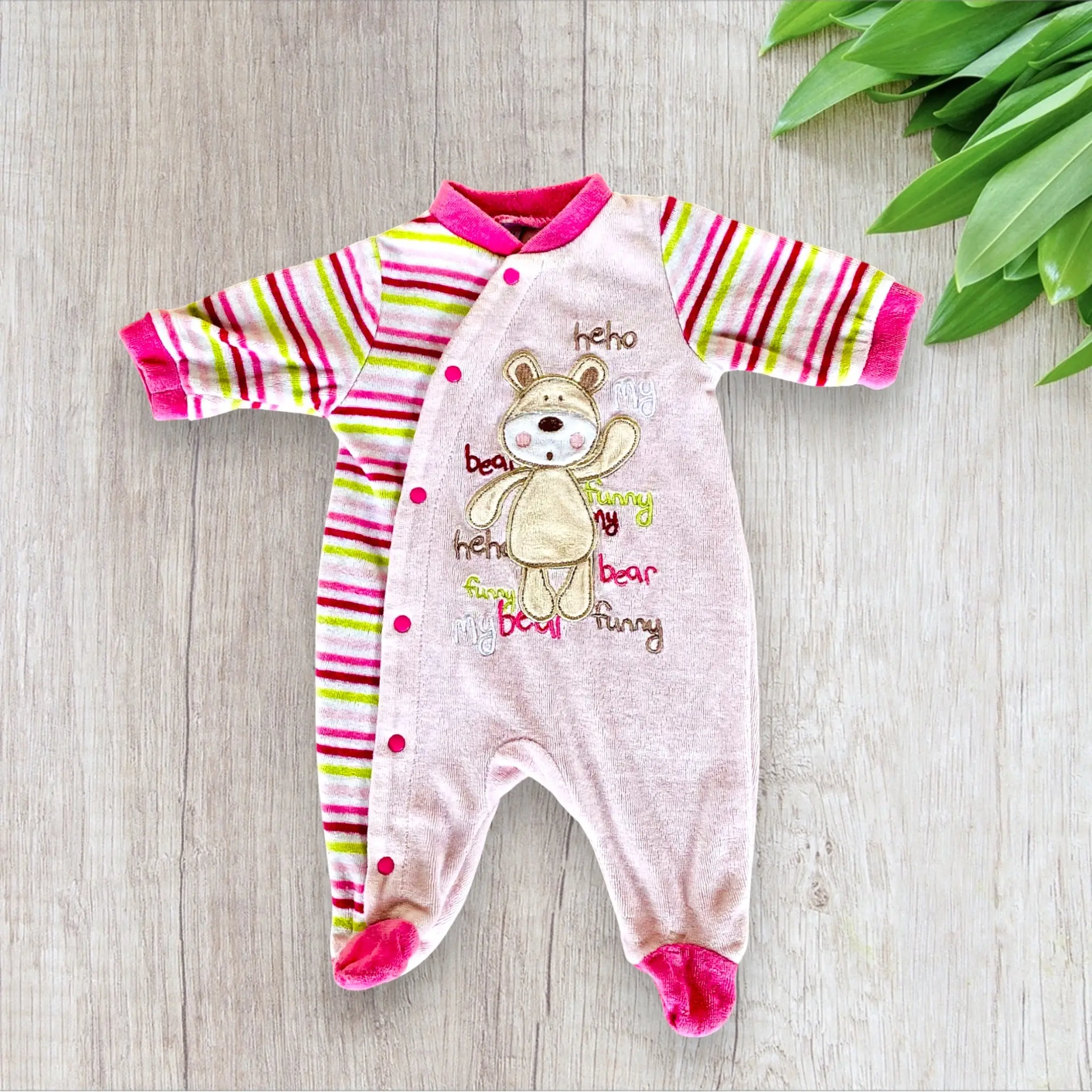 Craquez pour ce pyjama bébé fille en 1 mois, alliant douceur et style pour le confort de votre petite. Ce pyjama en polaire rose clair présente un adorable motif d’ours sur le ventre, agrémenté d’écritures colorées en rose fuchsia, blanc, beige et vert clair. Voici ses caractéristiques principales :