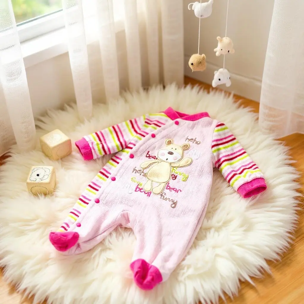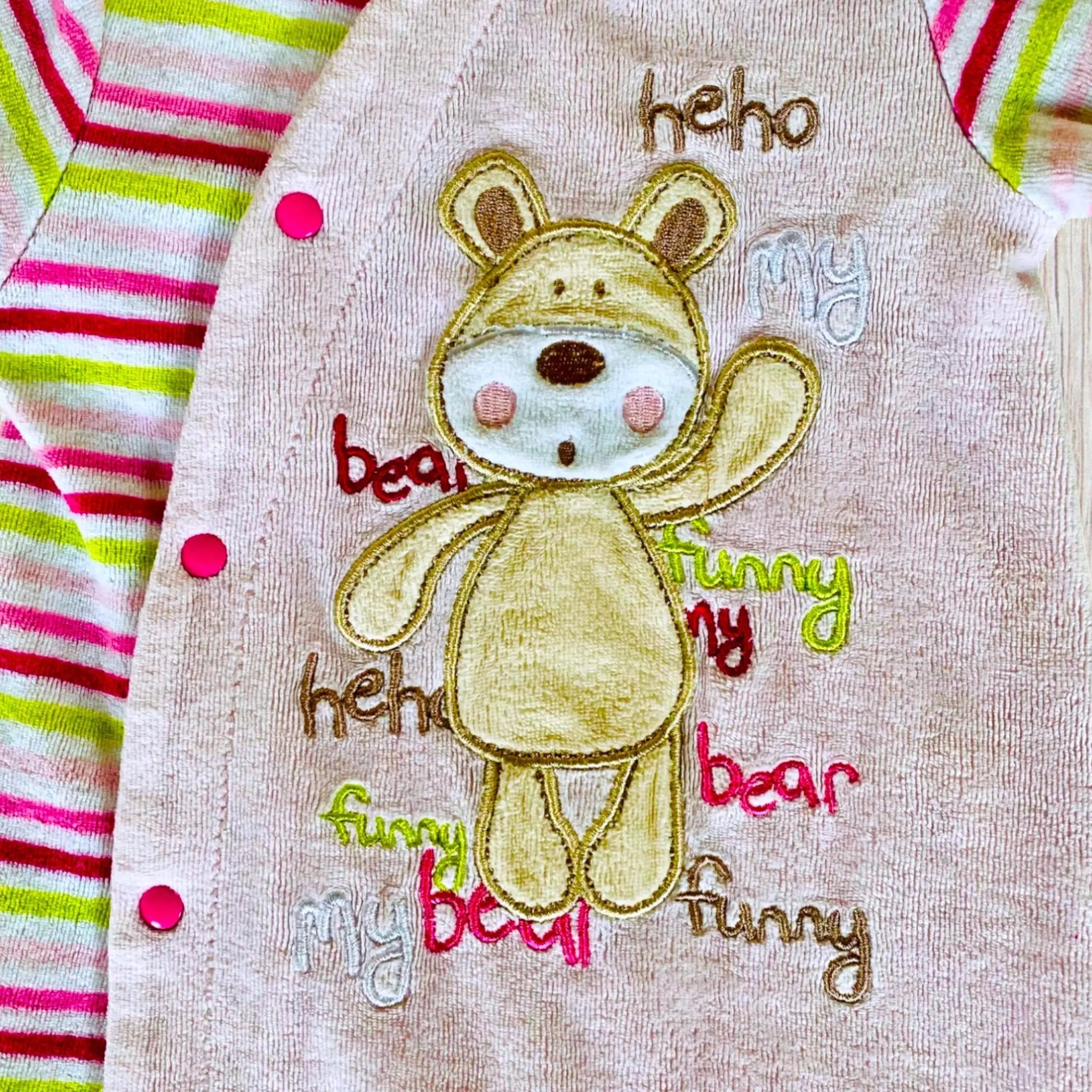 - Motifs : Ours sur le ventre et inscriptions colorées (rose fuchsia, blanc, beige, vert clair).