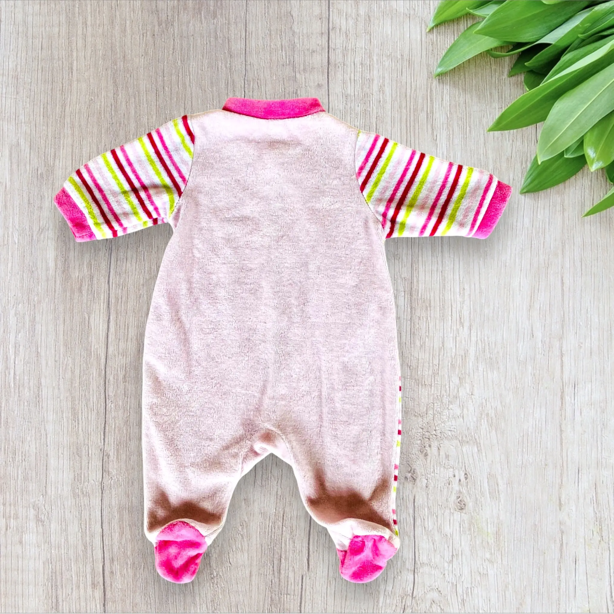 - Couleur : Rose clair avec des manches rayées rose fuchsia et vert clair.