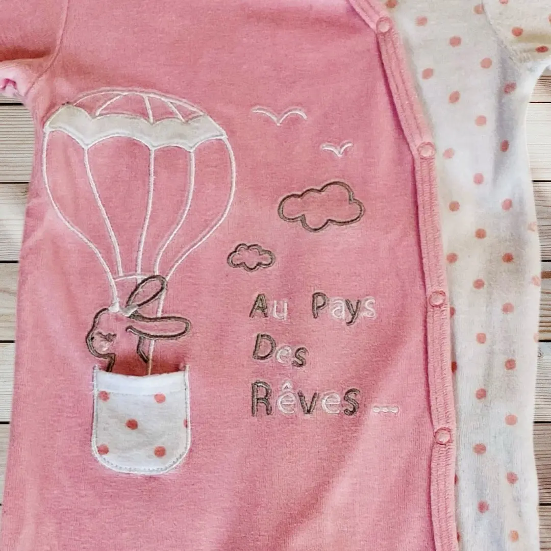Adorable pyjama 1 pièce pour bébé fille en 12 mois de la marque Mes Petits Cailloux, conçu pour allier douceur et fantaisie. Ce pyjama unique est rose uni d’un côté et blanc à pois rose de l’autre, avec une broderie charmante d’un lapin gris en montgolfière. La poche en forme de panier à pois ajoute une touche ludique, tandis que des broderies d’oiseaux, nuages et textes complètent le look. Fermeture pratique par boutons-pression latéraux, manches longues et pieds intégrés blancs à pois rose pour garder bébé bien au chaud.