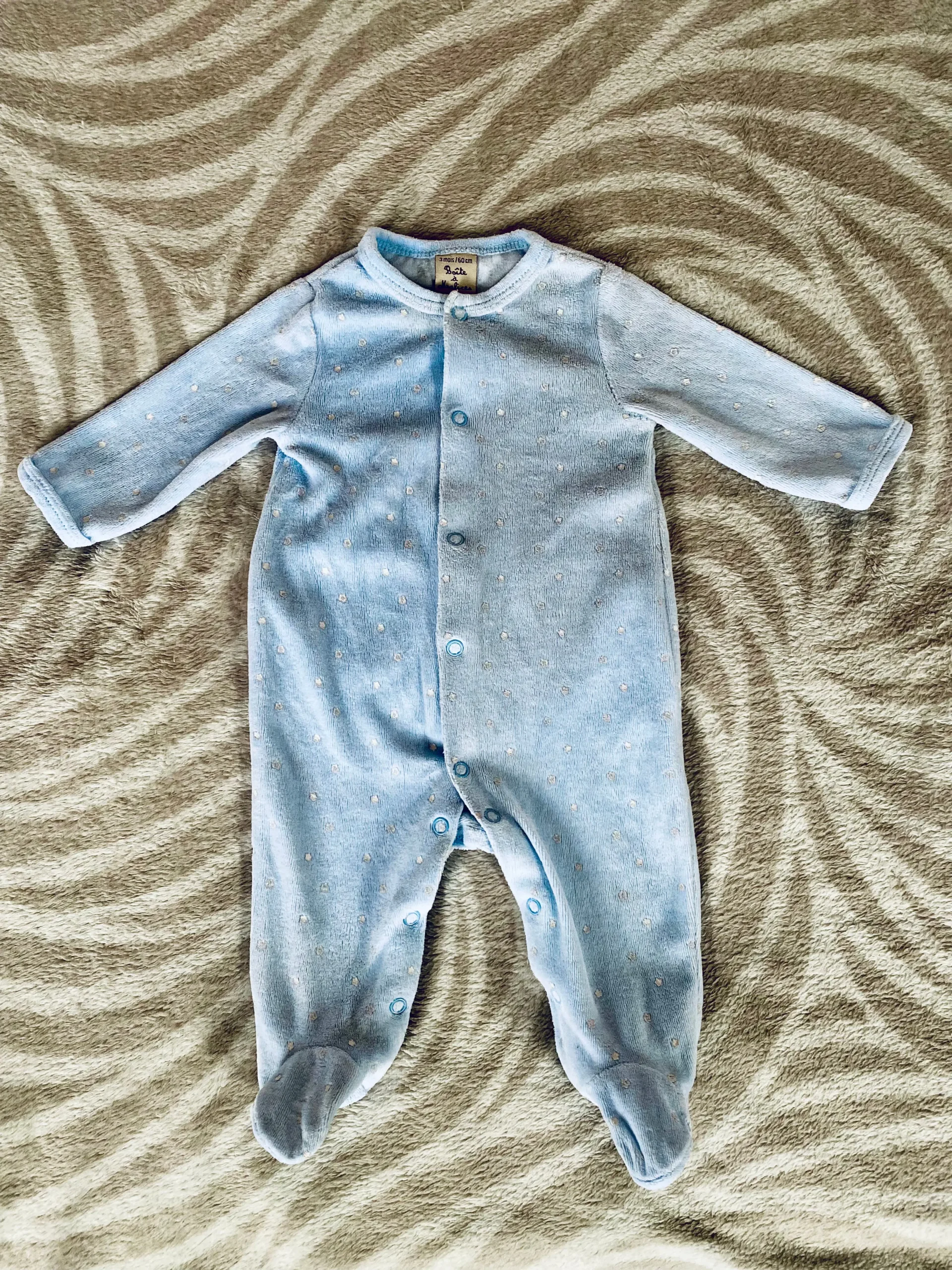 Pyjama Bébé Garçon en Polaire Bleu Clair à Étoiles Blanches – 3 Mois – Boite à Malice