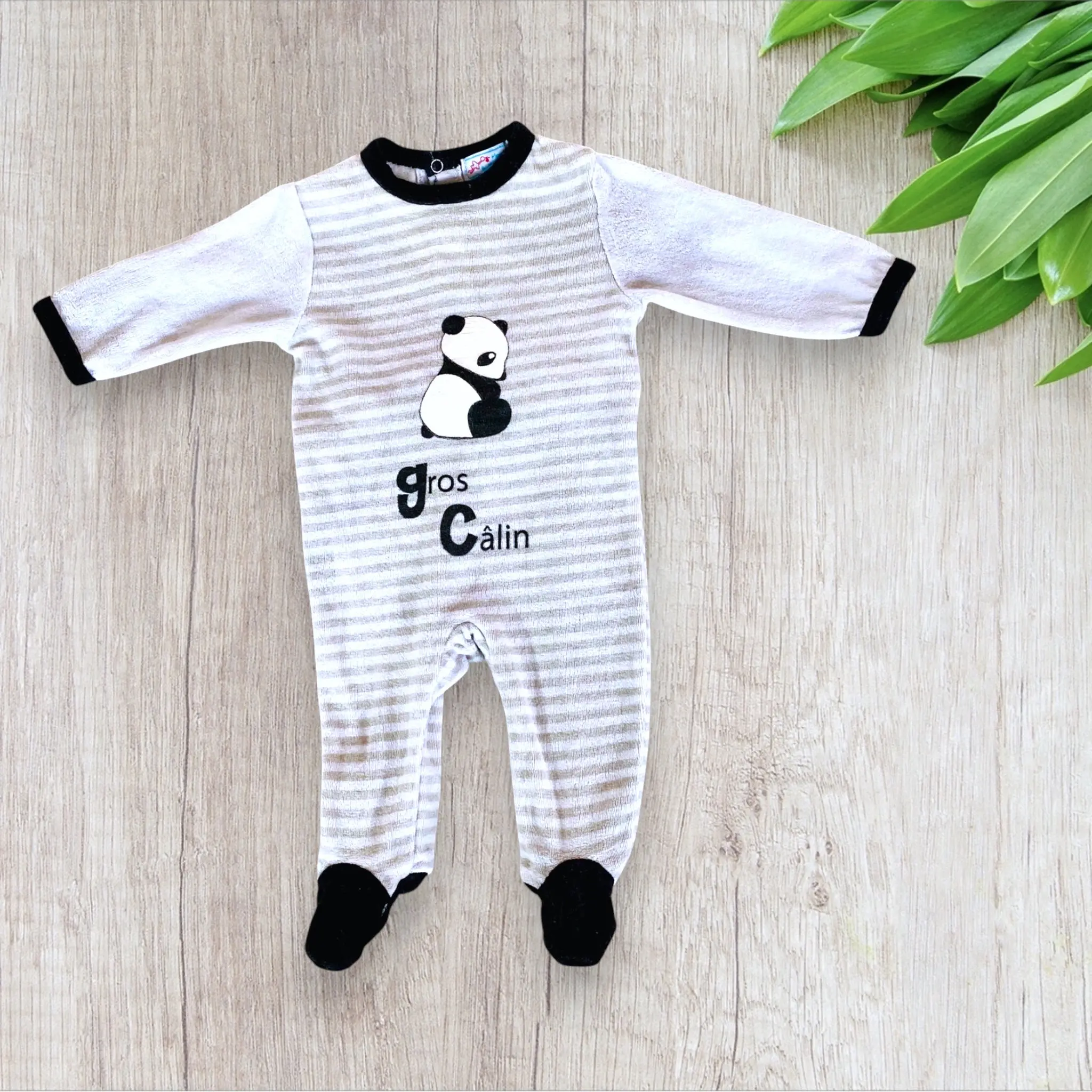 Pyjama Bébé Mixte en Polaire – Blanc à Rayures Grises avec Panda – 3 Mois – Manon et Valentin