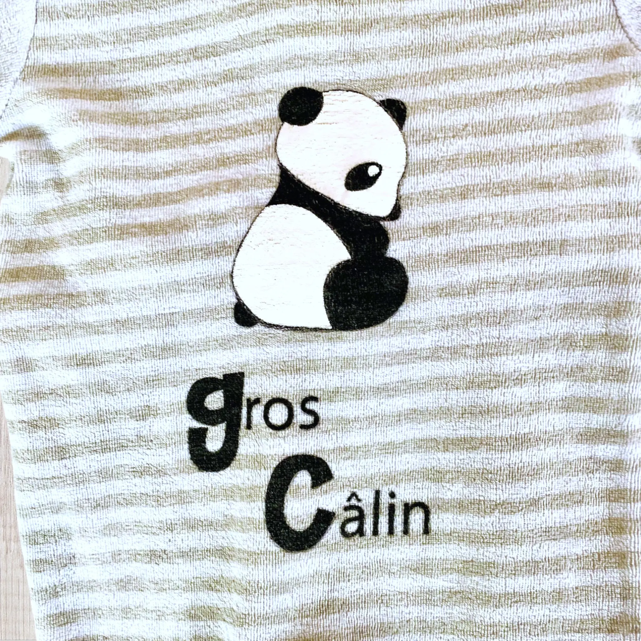 - Couleur : Blanc à Rayures Grises Claires avec Panda et Écritures Noires