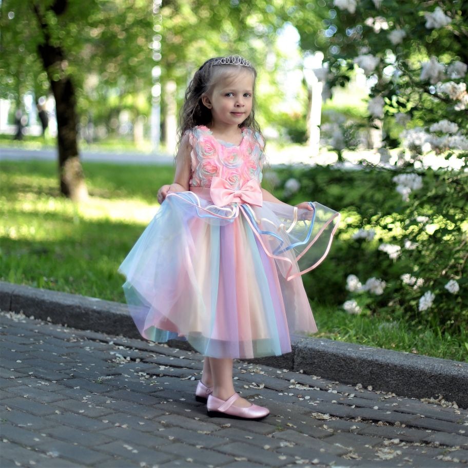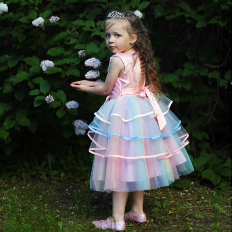 Cette superbe robe arc-en-ciel de princesse pour fille est une robe idéale pour un mariage champêtre, une fête d’anniversaire en plein air ou tout autre grand événement estival.