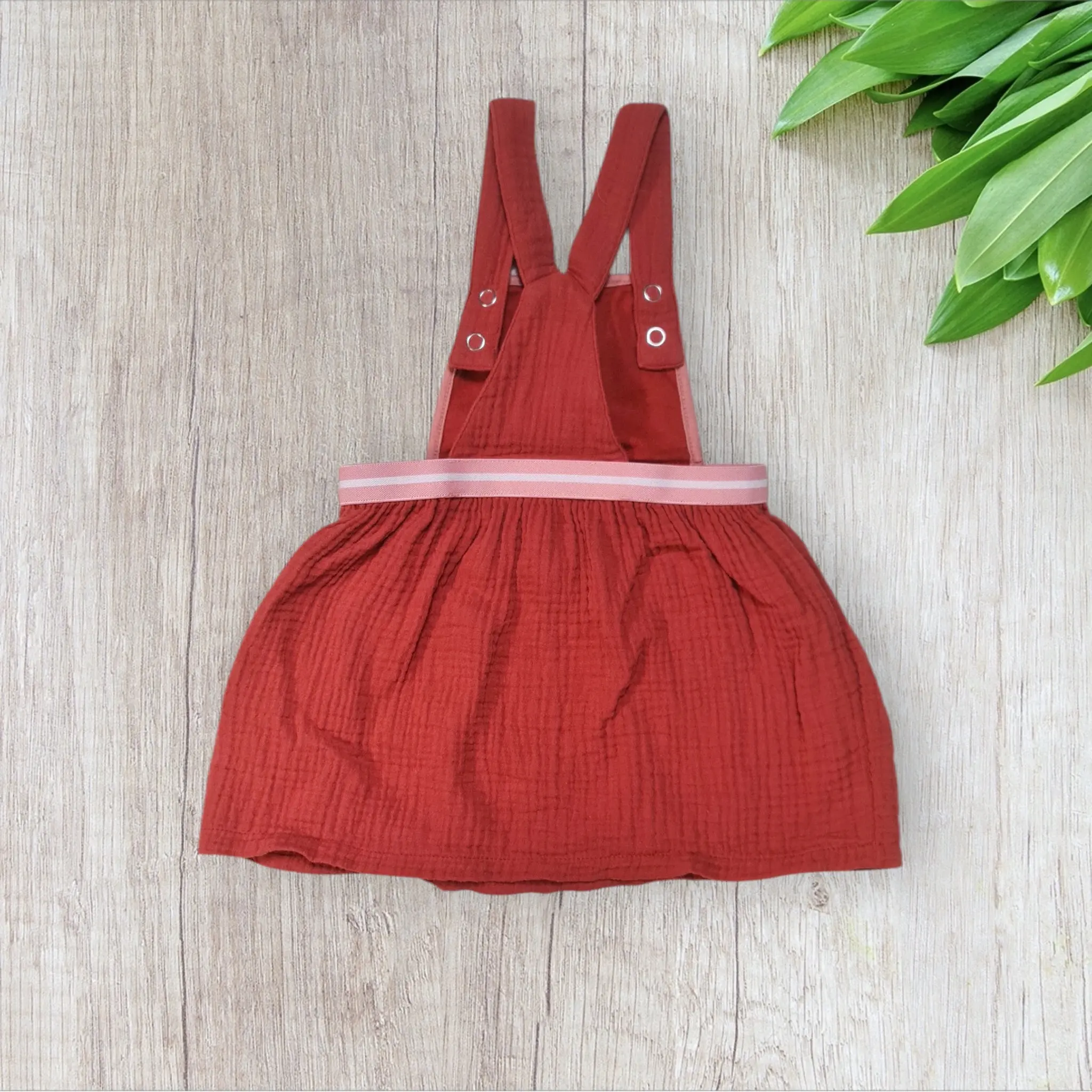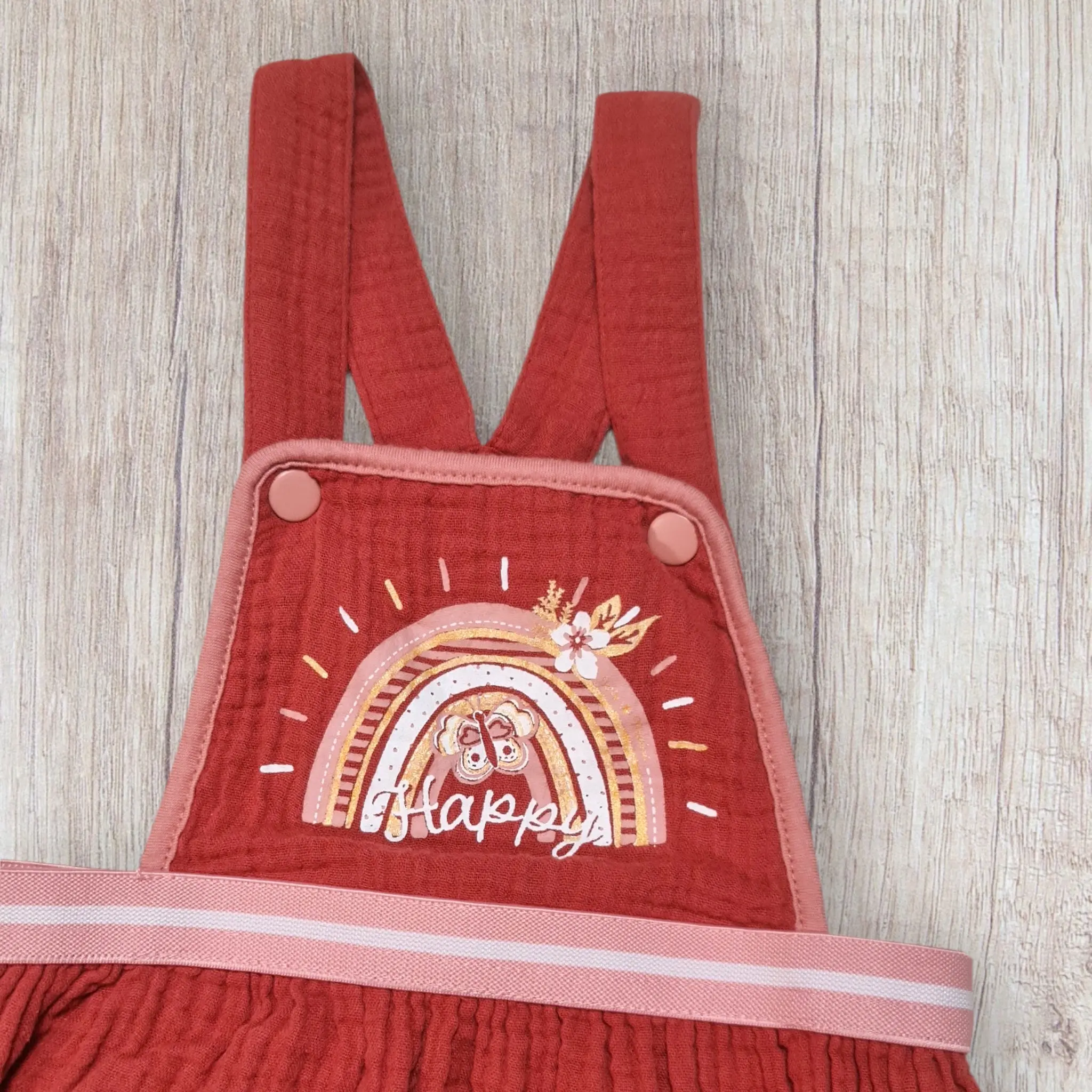 Robe bébé fille Terre de Marins – 9 mois – Gaze de coton brique – Bretelles salopette & motif arc-en-ciel