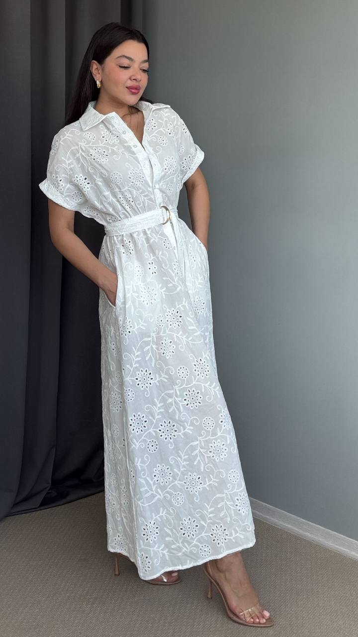 Robe Chemise Brodée “Blanche” – Ceinture à nouer
