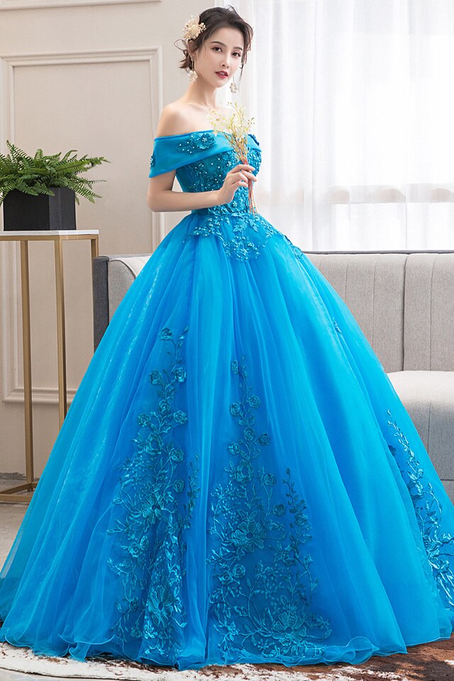 Immergez-vous dans une valse d’élégance avec la Robe de Bal Bleue Épaules Dénudées. Sa teinte envoûtante de bleu turquoise évoque les rivages paradisiaques, tout en se fondant délicieusement avec des broderies florales.