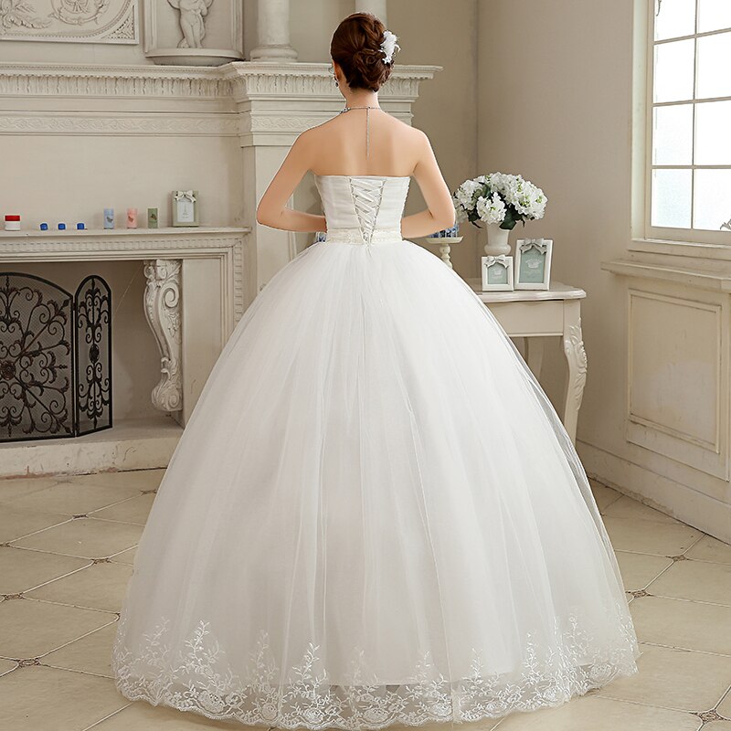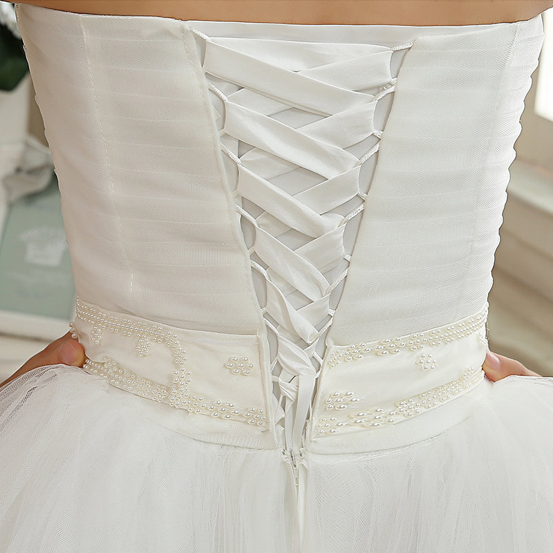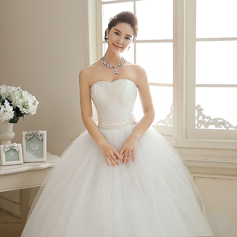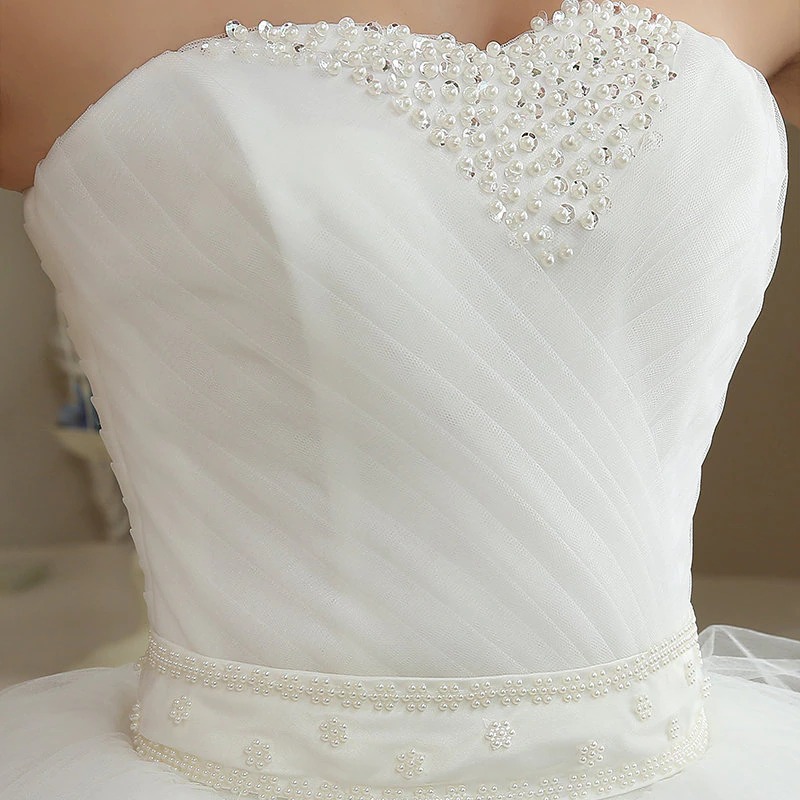 Ce modèle de tenue de mariage princesse se distingue par son design simple, mais tout en dégageant une aura de luxe. Vous apprécierez notamment son bustier sans manches à plis plats et ornés de perles.