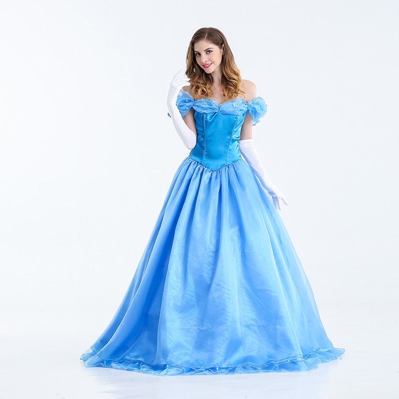 Cette tenue de princesse femme s’inspire en effet de la robe de bal offerte par la bonne fée Marraine à Cendrillon pour que celle-ci puisse vivre une soirée idyllique en compagnie de son prince charmant.