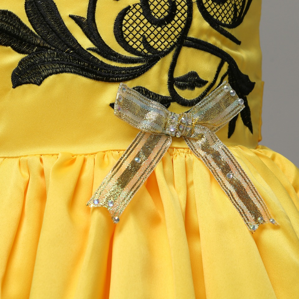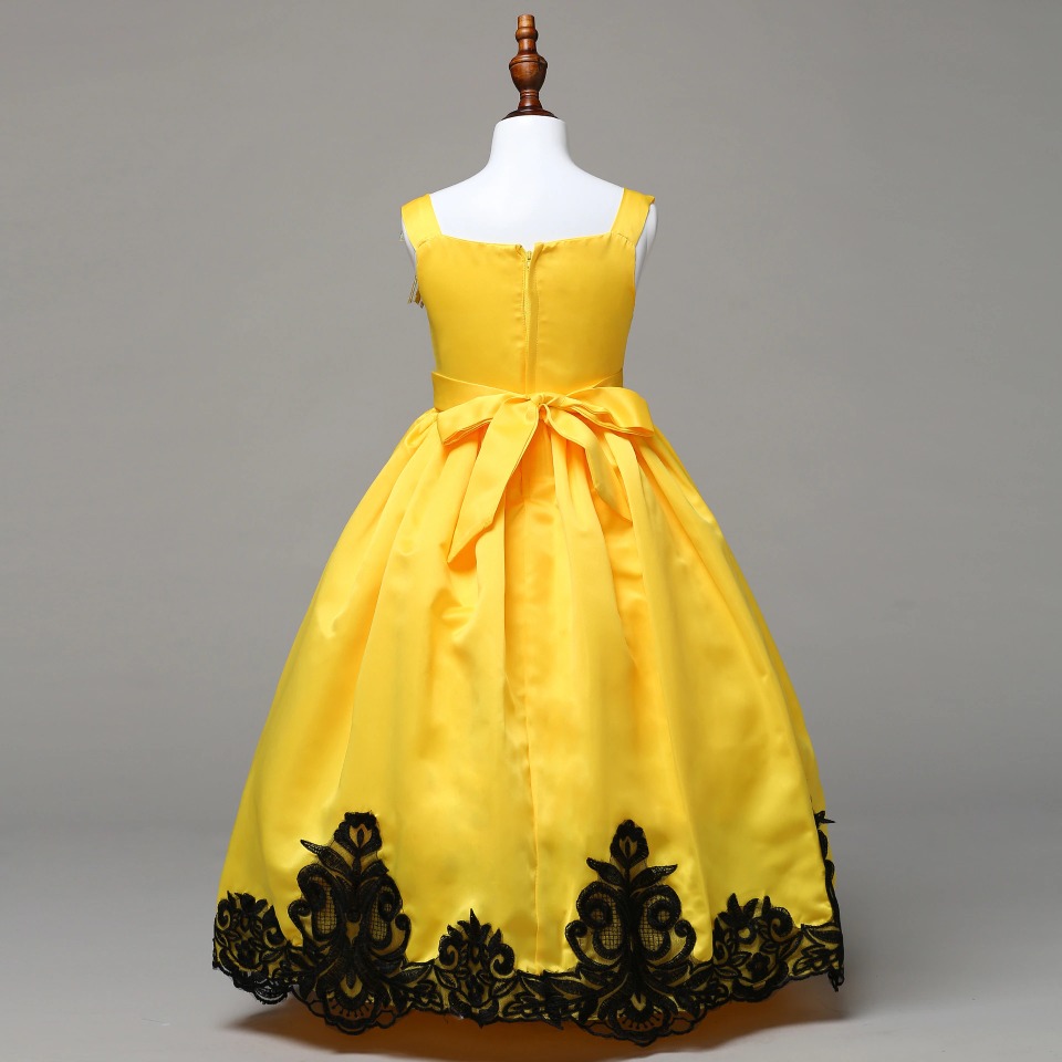 Découvrez cette robe longue de bal jaune ornée de guipure noire pour votre admirable petite fille. Adaptée pour les célébrations et fêtes.